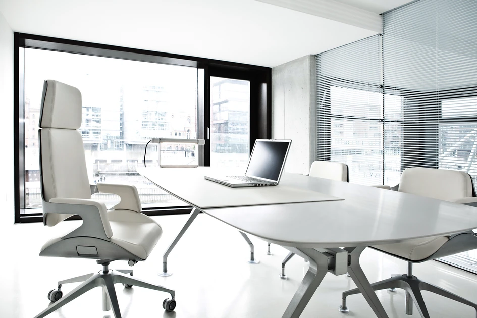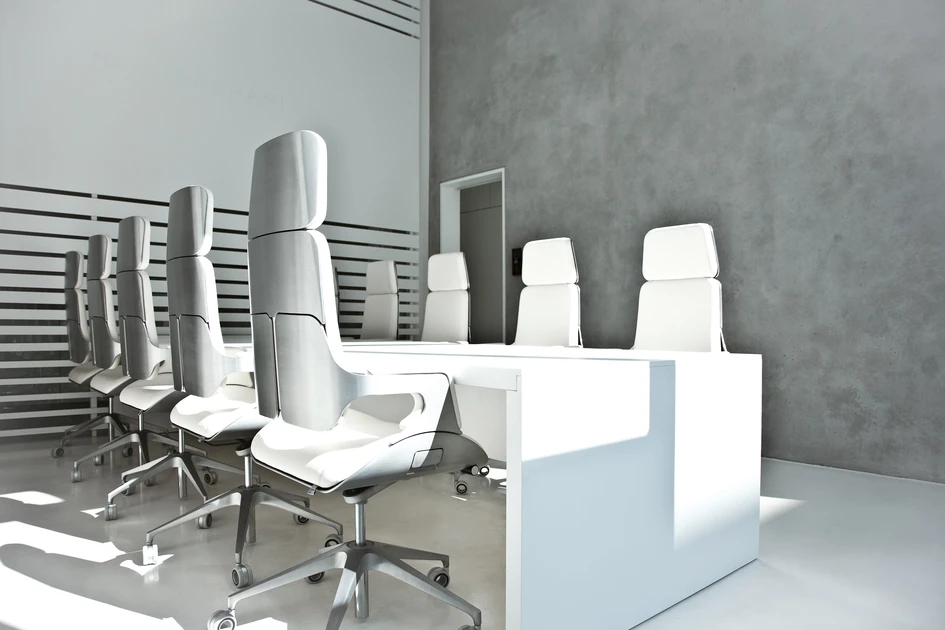 The leather cushioned »Silver«- chairs made of smooth, polished metal surfaces or wood, the table tops made of mineral Cocon, wood and glass, a multimedia sideboard and a large conference table are accents in the otherwise completely white room, which not least due to the furniture portrays the perfect symbiosis of architecture and interior.