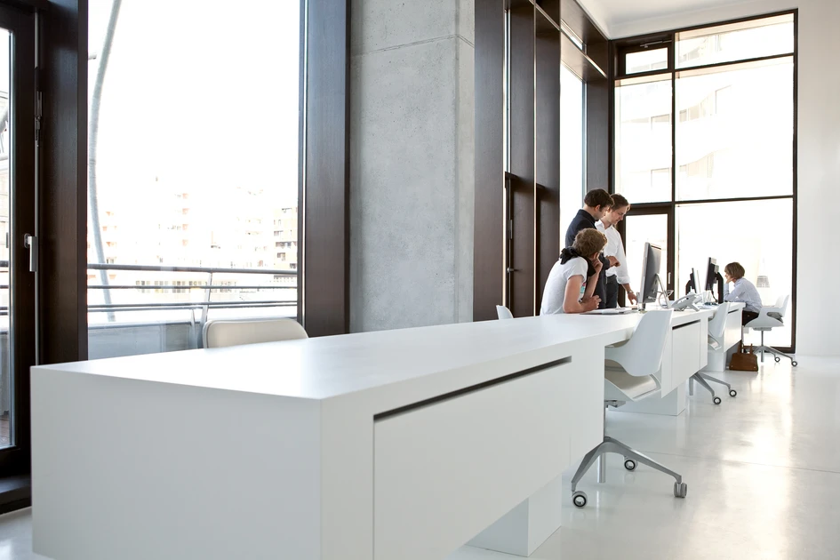 Insights, outlooks, transparency on 265m² between fleet and plaster: A long and very high corridor, opened up as an »entrance hose«, in five metre high spaces, provides an inspiring and airy feeling throughout the whole studio. Openness, transparency and flexibility are the dominant themes. Generous window fronts in the showroom looking out at the Kaiserkai on the street side and the museum port on the other side, emphasise the idea of exchange and dialogue from inside to outside. Flexible interior of Interstuhl Both the conference room / showroom and all of the work places are furnished with the clear, »silver« furniture range by Interstuhl, which has been awarded with many design prizes. It characterises the new studio with its unmistakeable design statement and offers not only an aesthetic but also the perfect functional basis for all processes.