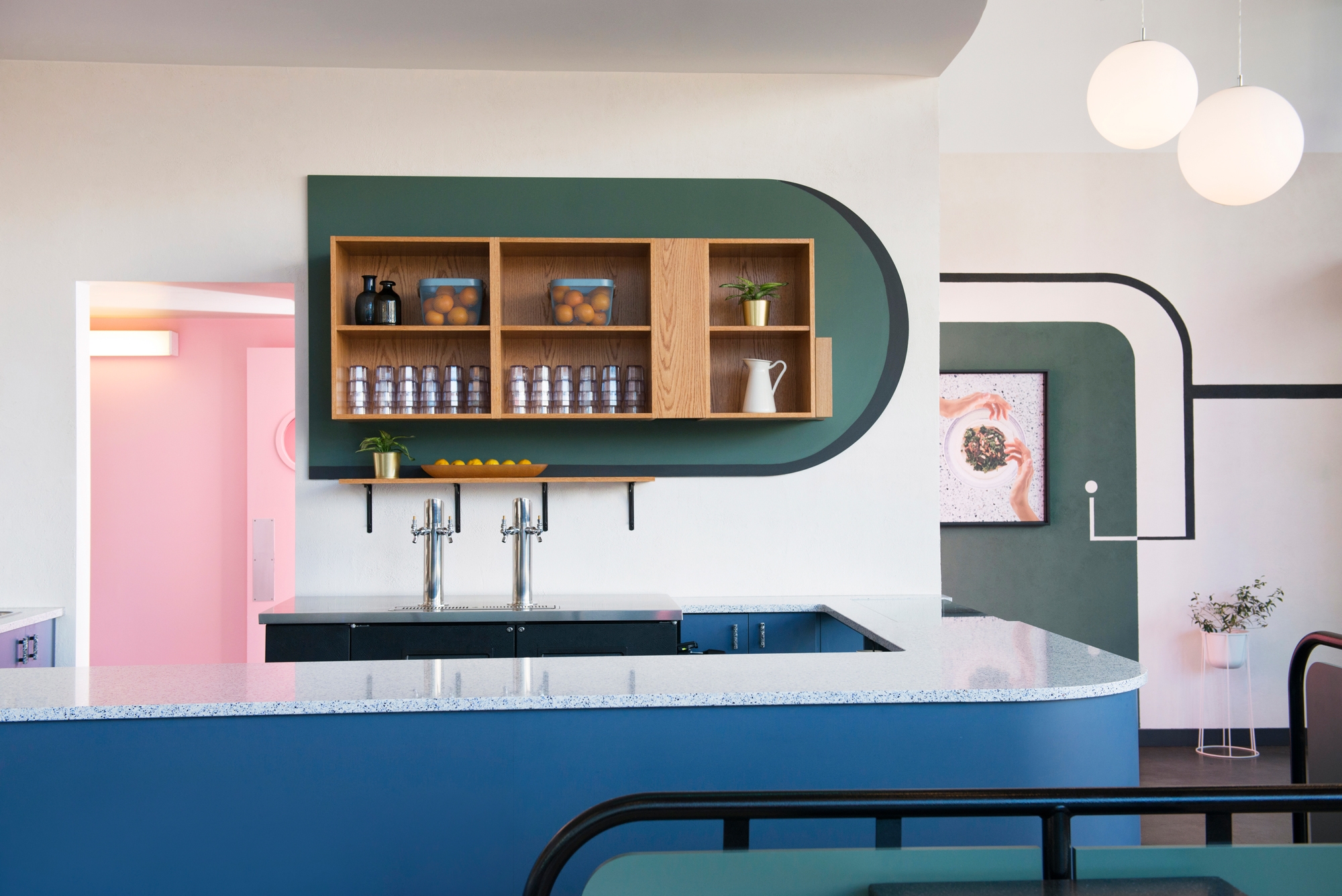 This nod to the traditional is offset with bold, contemporary colors of varying shades of blues, greens and pinks painted on the walls and used in the counter, shelving, and seating millwork. Plants, hand painted signage and warm lighting create a relaxing and comfortable atmosphere. The large Superbaba neon sign along with the light boxes on the exterior reference the neon seen everywhere in fast-casual spots in the Middle East.