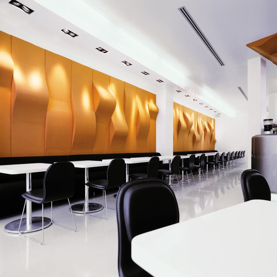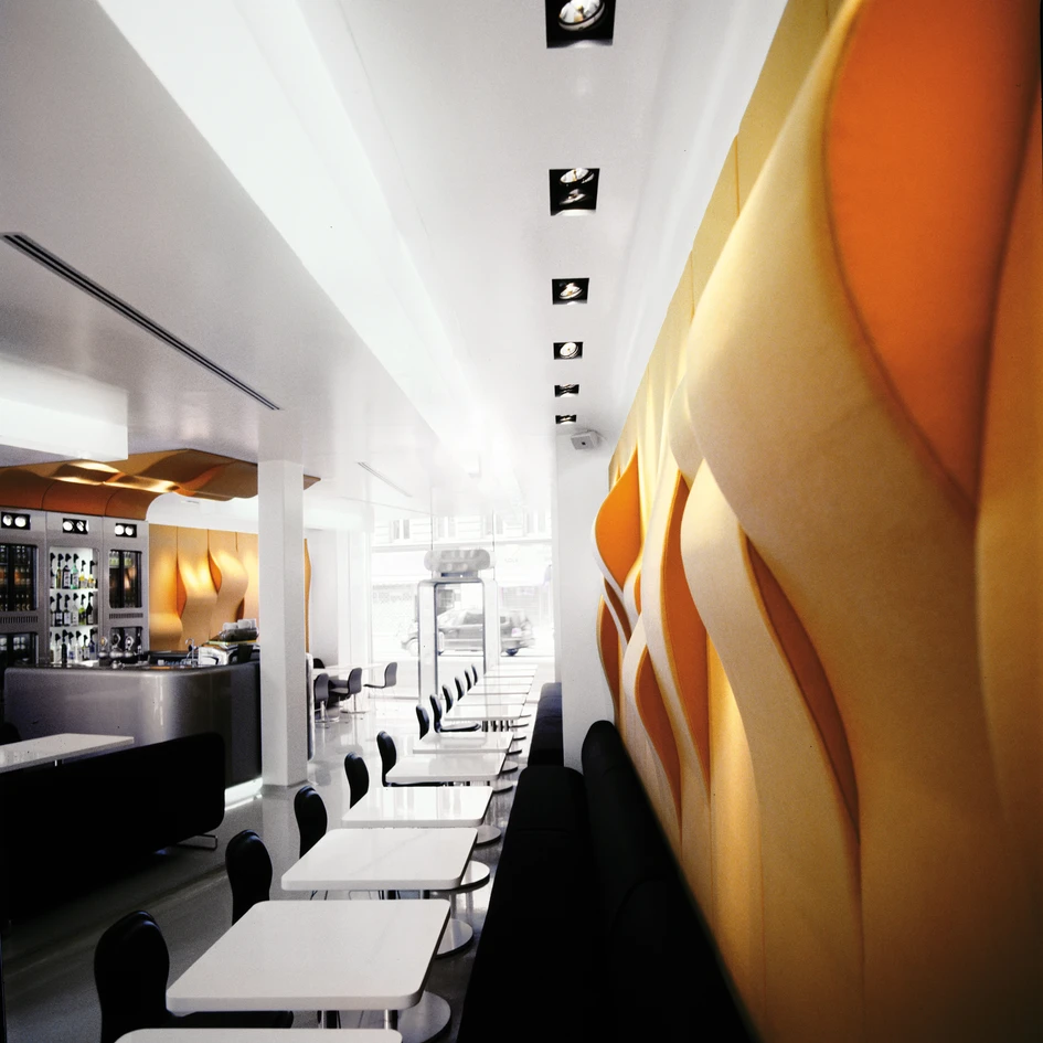 A vibrant concept café with curvy and voluptuous bright orange walls which provide a modern setting and cosy feel. Applying a holistic design approach the space evokes all senses. From the interior layout to the food, drinks and music; everything has been given special attention.