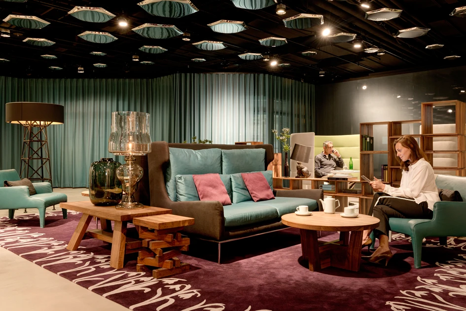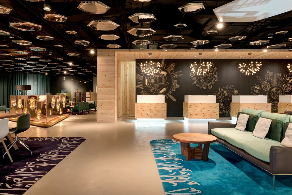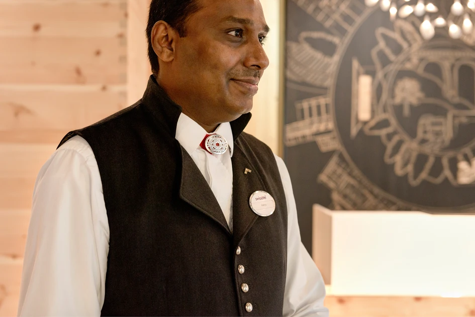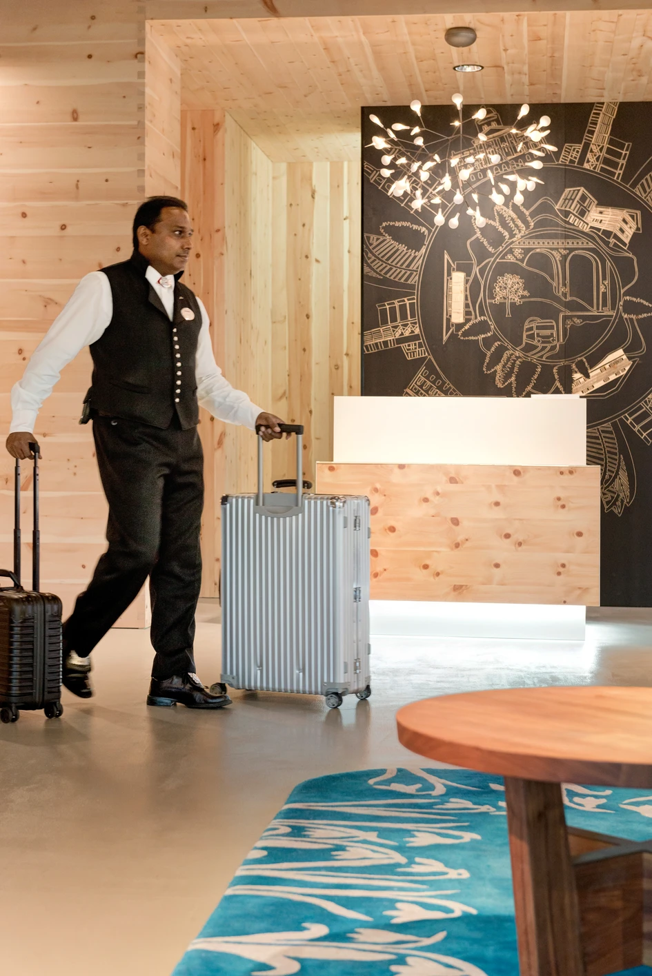 Next to the progressive furniture, which was created with natural recourses such as Swiss pine wood, the artistic play with the topic of snow gives the lobby its characteristic appearance. Elements made from chrome steel and etched with individual snowflakes hang from the ceiling. A film installation depicts Switzerland in all her raw beauty.