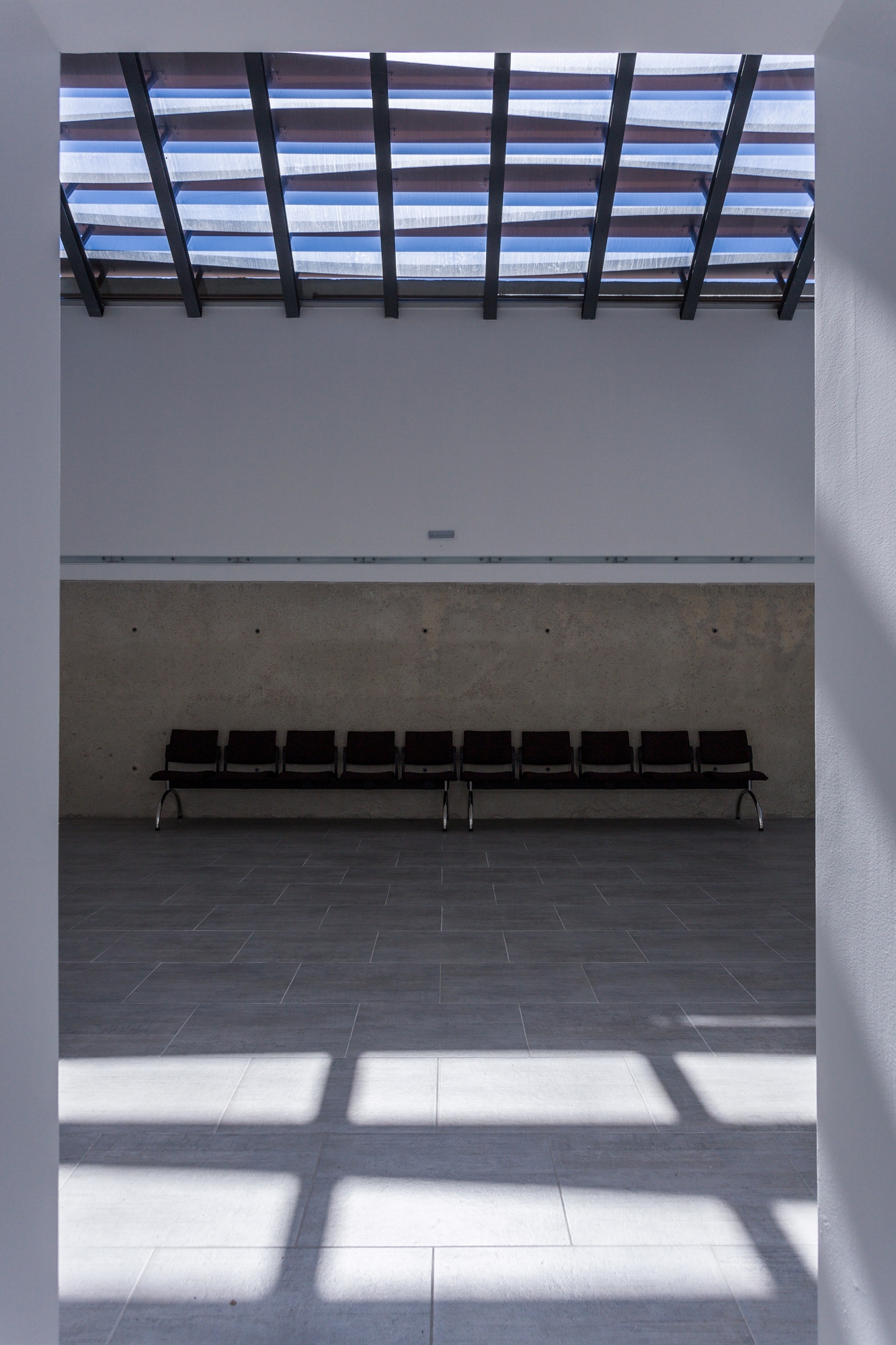 The site is a pine wood on the outskirts of a little town, the building is placed in its southern limit to define a new urban edge with a monumental architectural character. The public access is on the west side at the end of a pedestrian path coming from the urban area and leading into a hall space oriented South that articulates circulations to funeral parlors and restrooms.