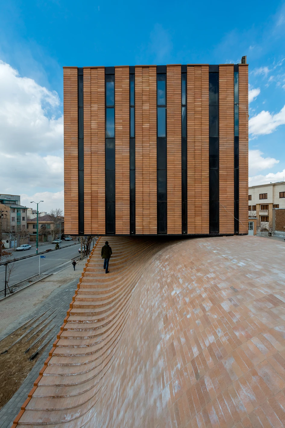 The building is designed to connect with the city’s public space and is influenced by Hamedan’s many public squares, which are linked by wide boulevards. One of these boulevards runs along one edge of the building, so the architects decided to emphasize the connection between the interior of the building and the street by bringing the roof down to meet the pavement.