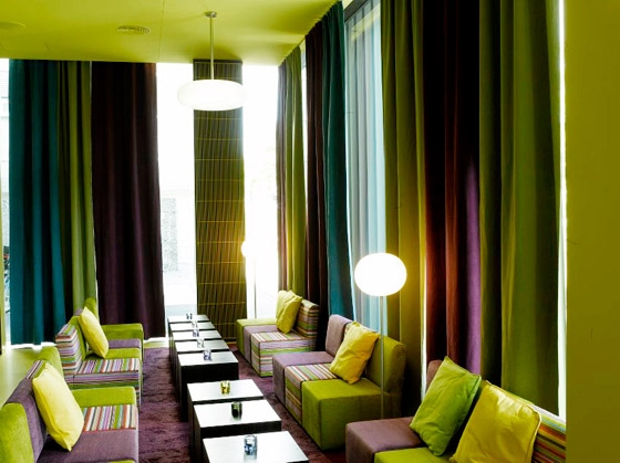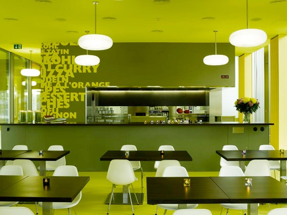 Das Gelb als Signatur-Farbe der ganzen Schulanlage wurde aufgenommen und mit kräftigen Farben wie Violett, Grün, Blau oder Pink in Vorhängen und Polsterbezügen kontrastiert.