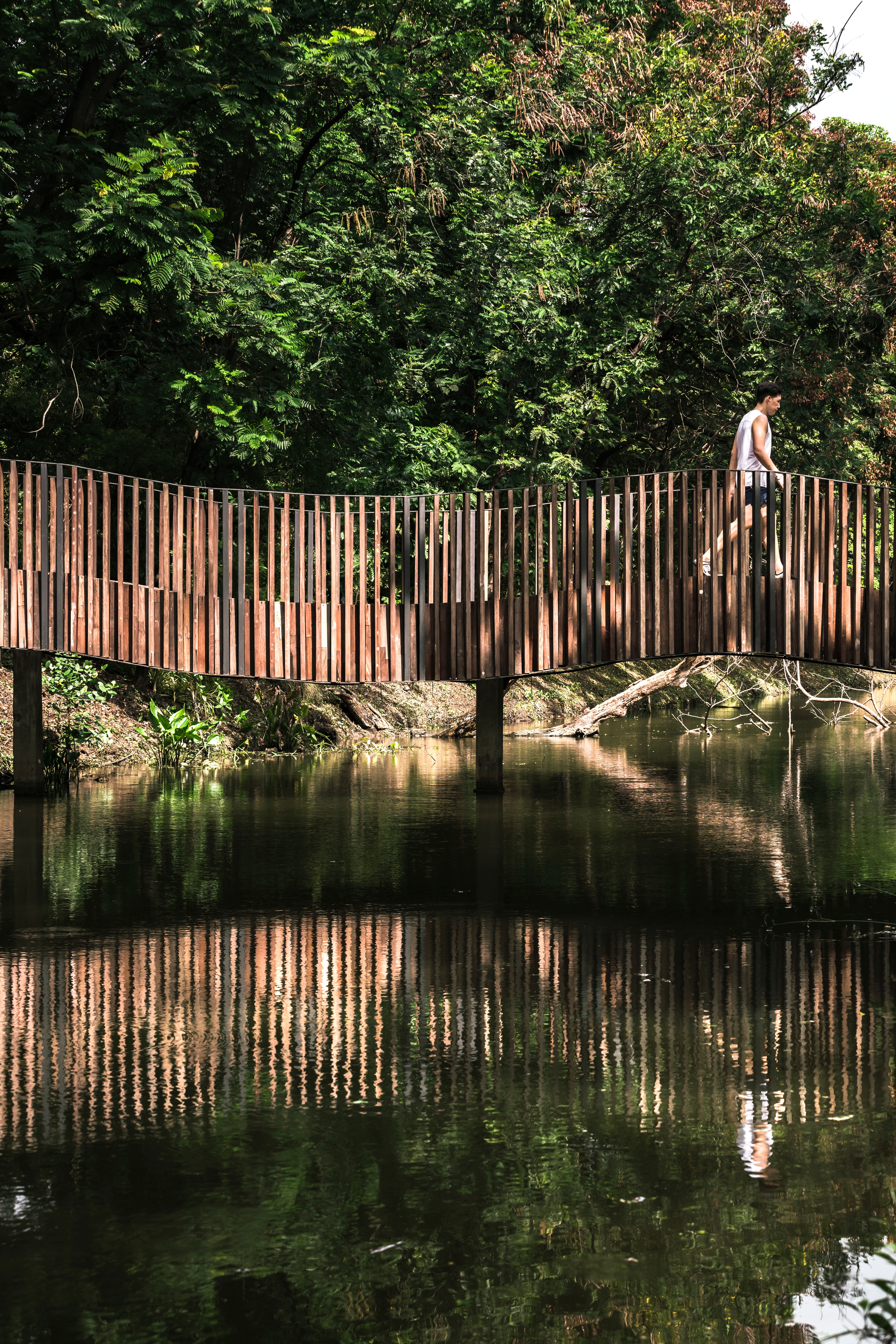 The Bird Wave Bridge, a 50 metre long pedestrian bridge crossing small watercourse from Rotfai Park to H.M. Queen Sirikit Park at the Northern part of Bangkok aims to bridge not only the physical gaps but also the public projects’ complicated process and general perceptions of urban parks.