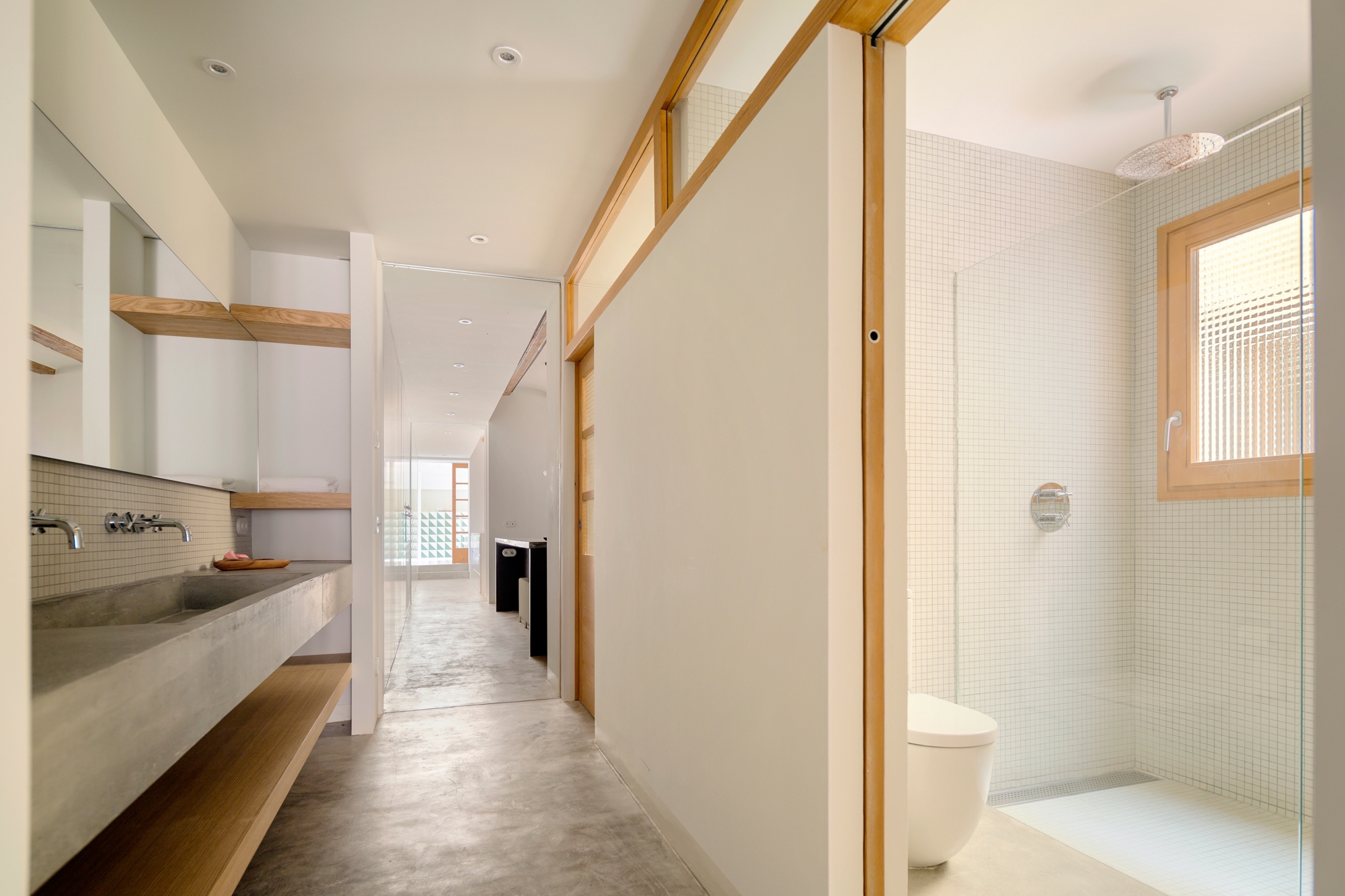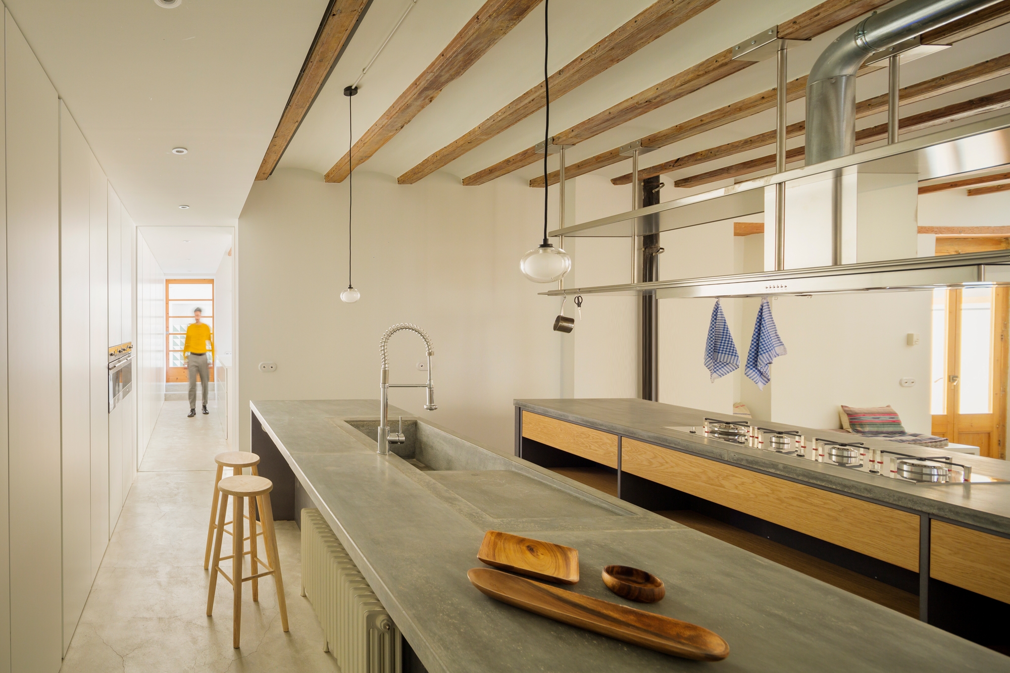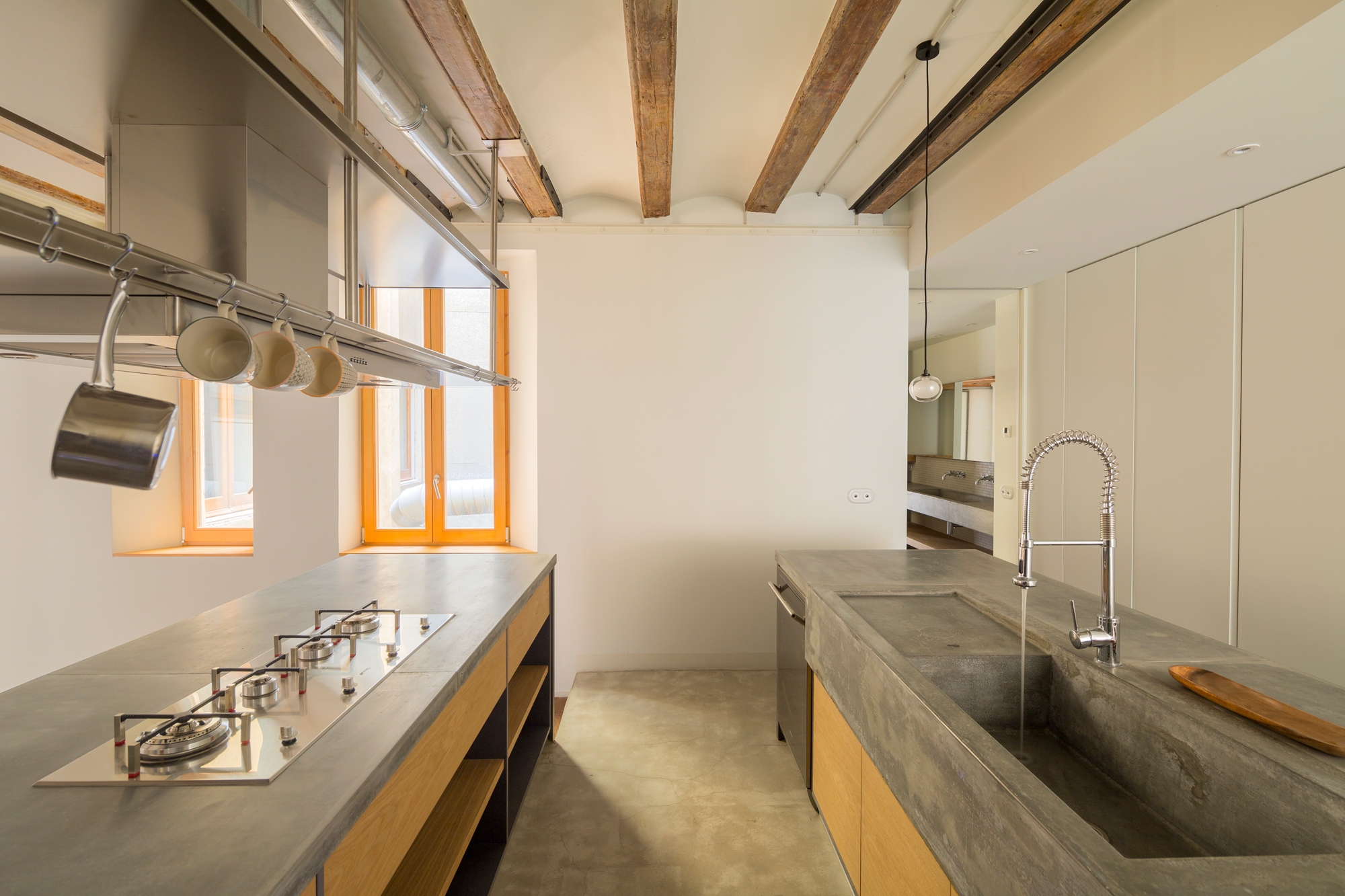 Once the building was stripped down, new materials and finishing textures were selected in line with the existing materials. We used concrete for the worktops, the sinks and to complement the flooring; we used wood for the shelving and storage areas; and we used steel for the room dividers and the open clothes storage. In the terrace, we concentrated on restoring the original elements, such as the balustrades. We also redesigned the layout, creating overlapping sections on different levels, in order to optimise the use of the space. Just as with the building’s interior, the existing ceramic tiles were used.