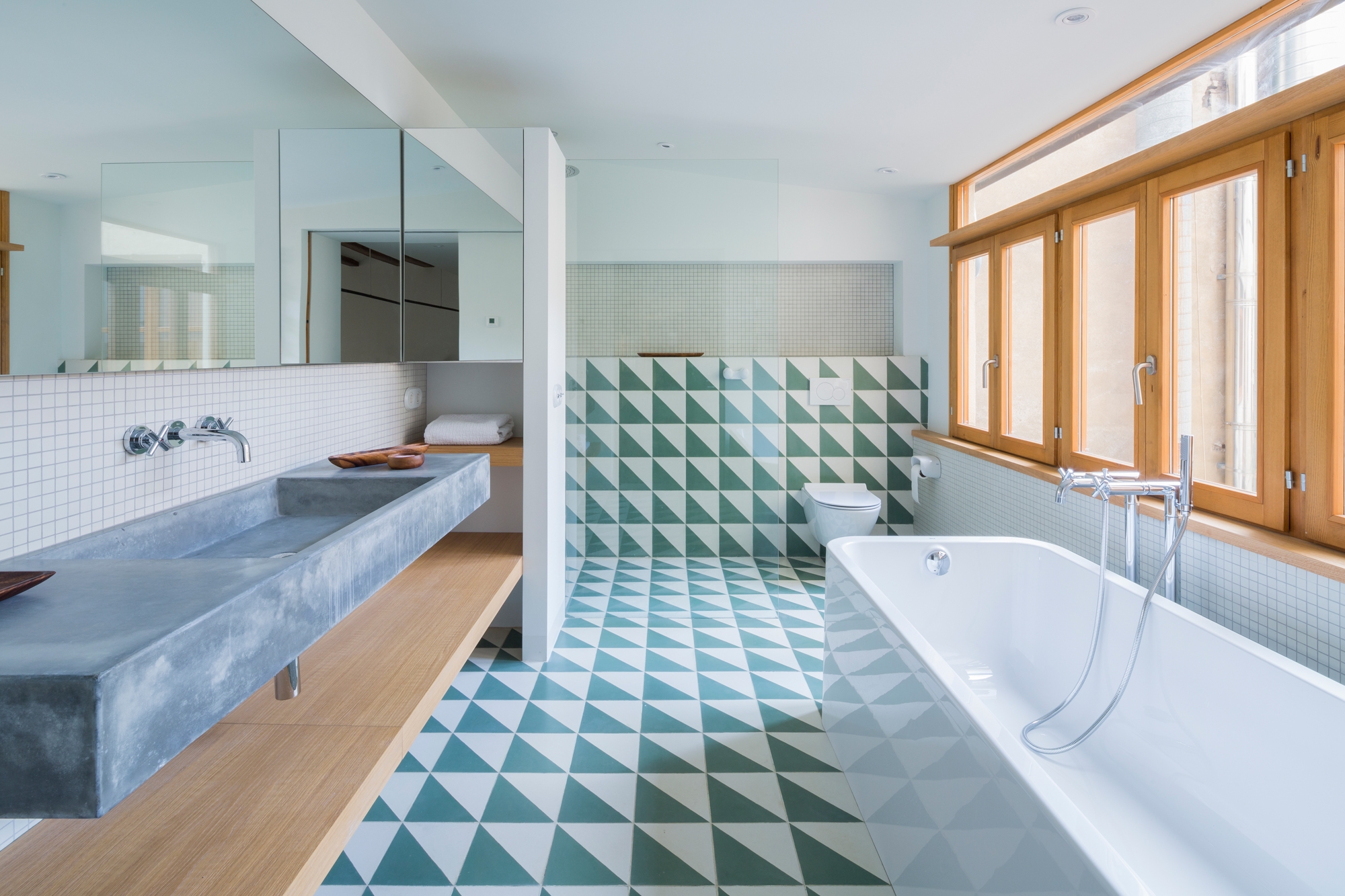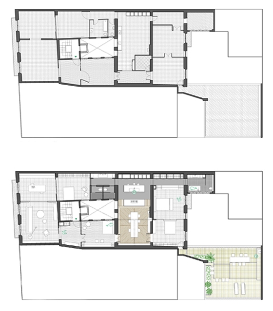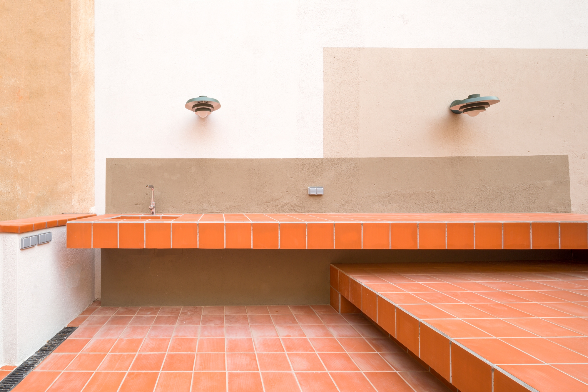 Once the building was stripped down, new materials and finishing textures were selected in line with the existing materials. We used concrete for the worktops, the sinks and to complement the flooring; we used wood for the shelving and storage areas; and we used steel for the room dividers and the open clothes storage. In the terrace, we concentrated on restoring the original elements, such as the balustrades. We also redesigned the layout, creating overlapping sections on different levels, in order to optimise the use of the space. Just as with the building’s interior, the existing ceramic tiles were used.