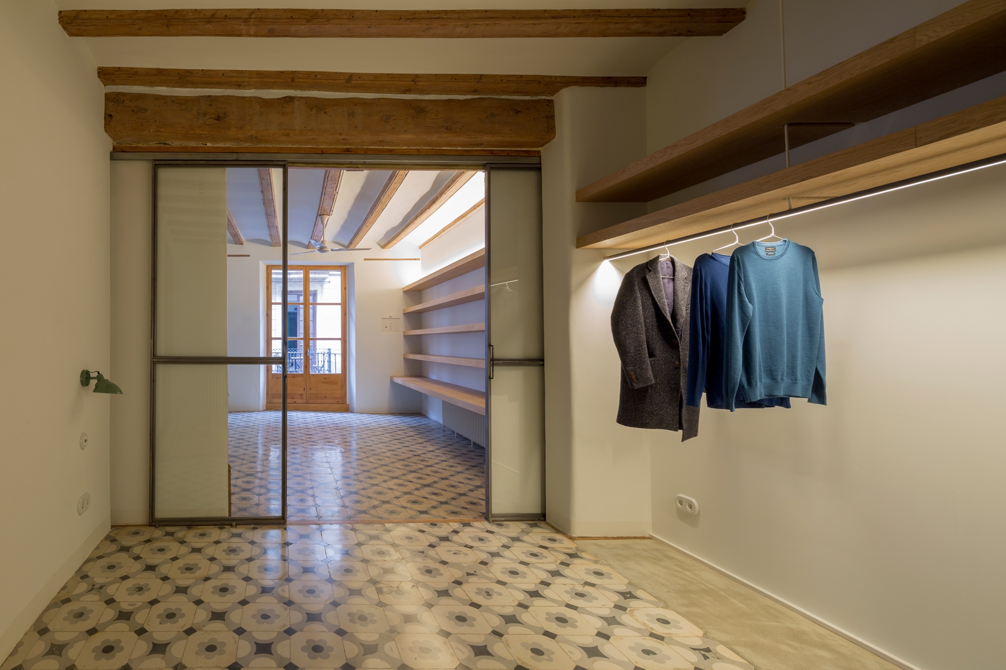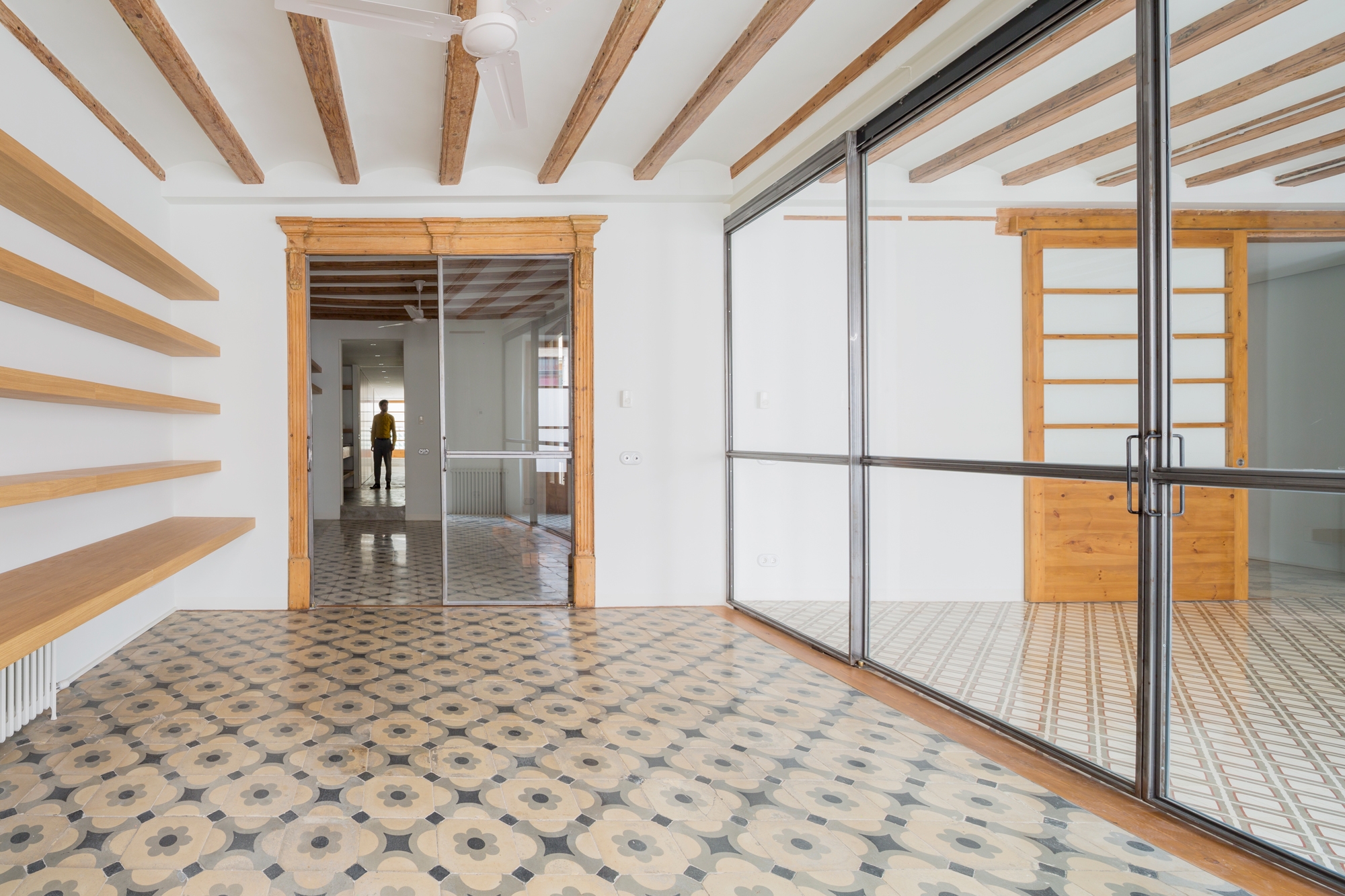 The apartment, located in a building in Raval, just a few metres from La Rambla, is an achievement of space. As you walk in, it opens up from the main façade to the rear terrace, which looks over the Boqueria market. Initially, we were surprised to see that the apartment occupied the entire floor of the building, with a contrast of large and small obsolete spaces and proportionally limited connection to the enormous, uneven terrace.