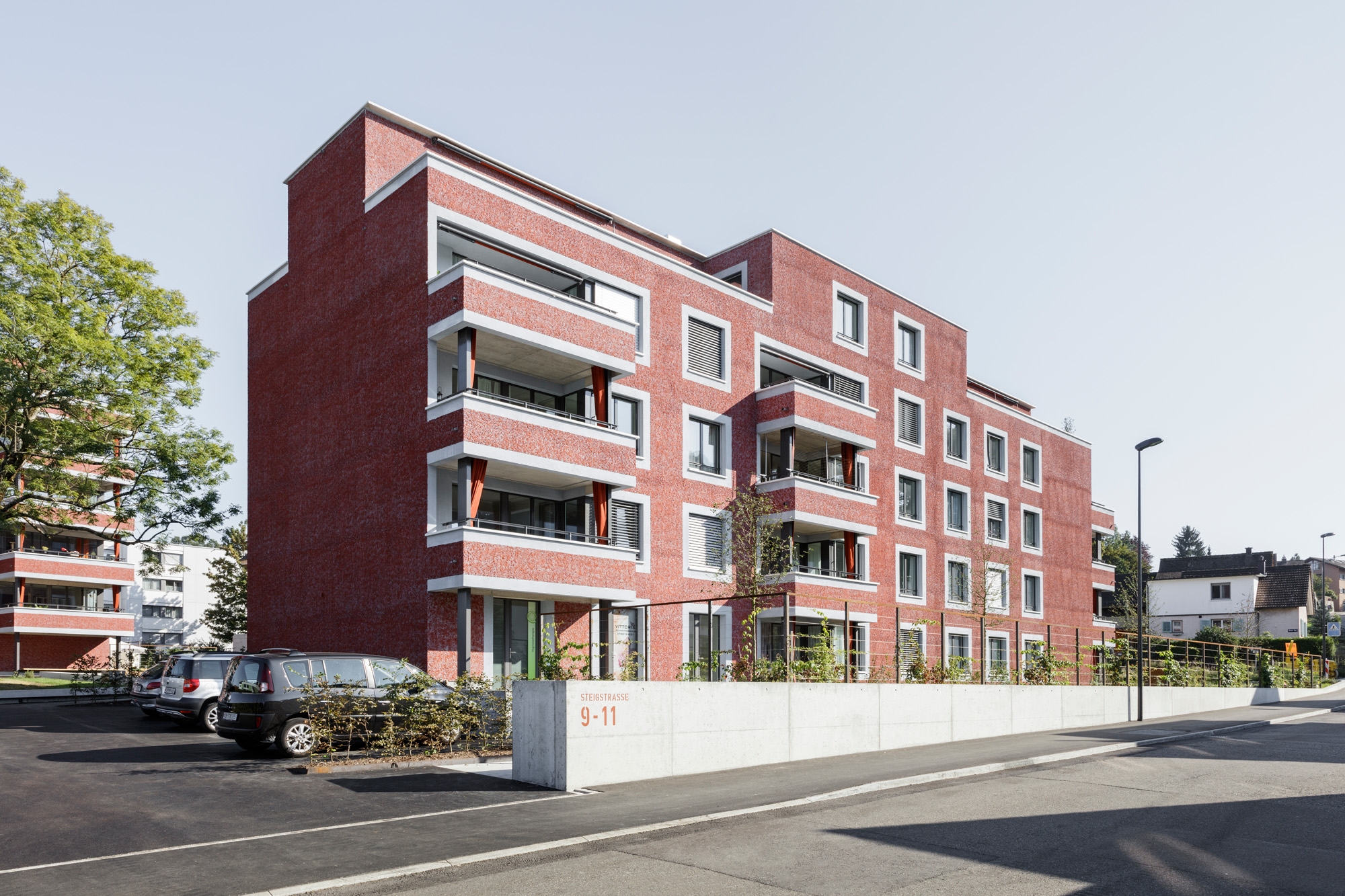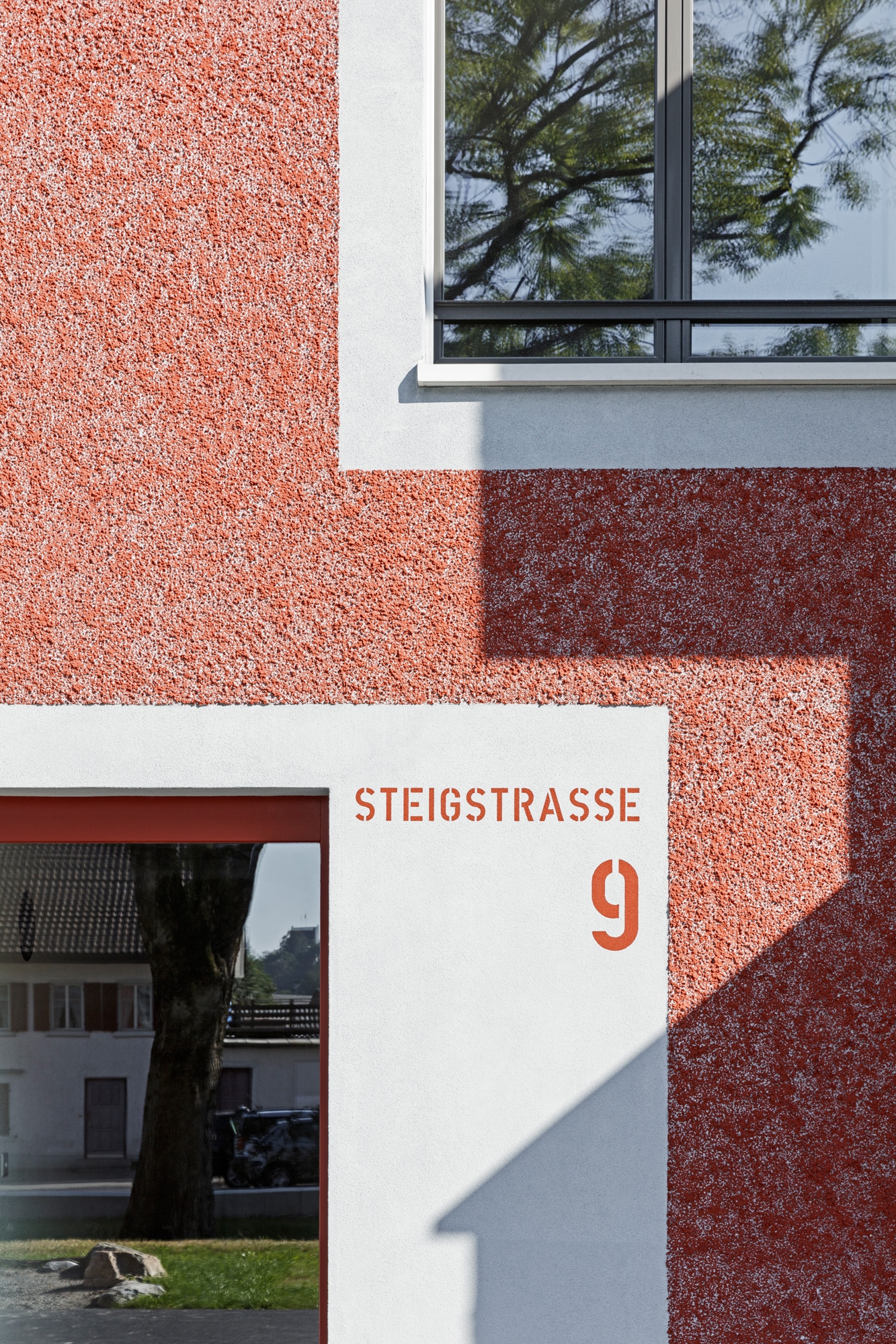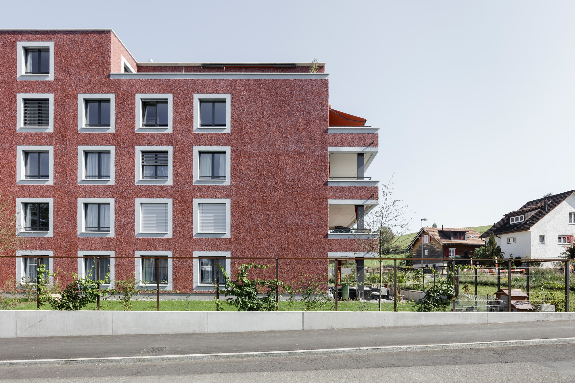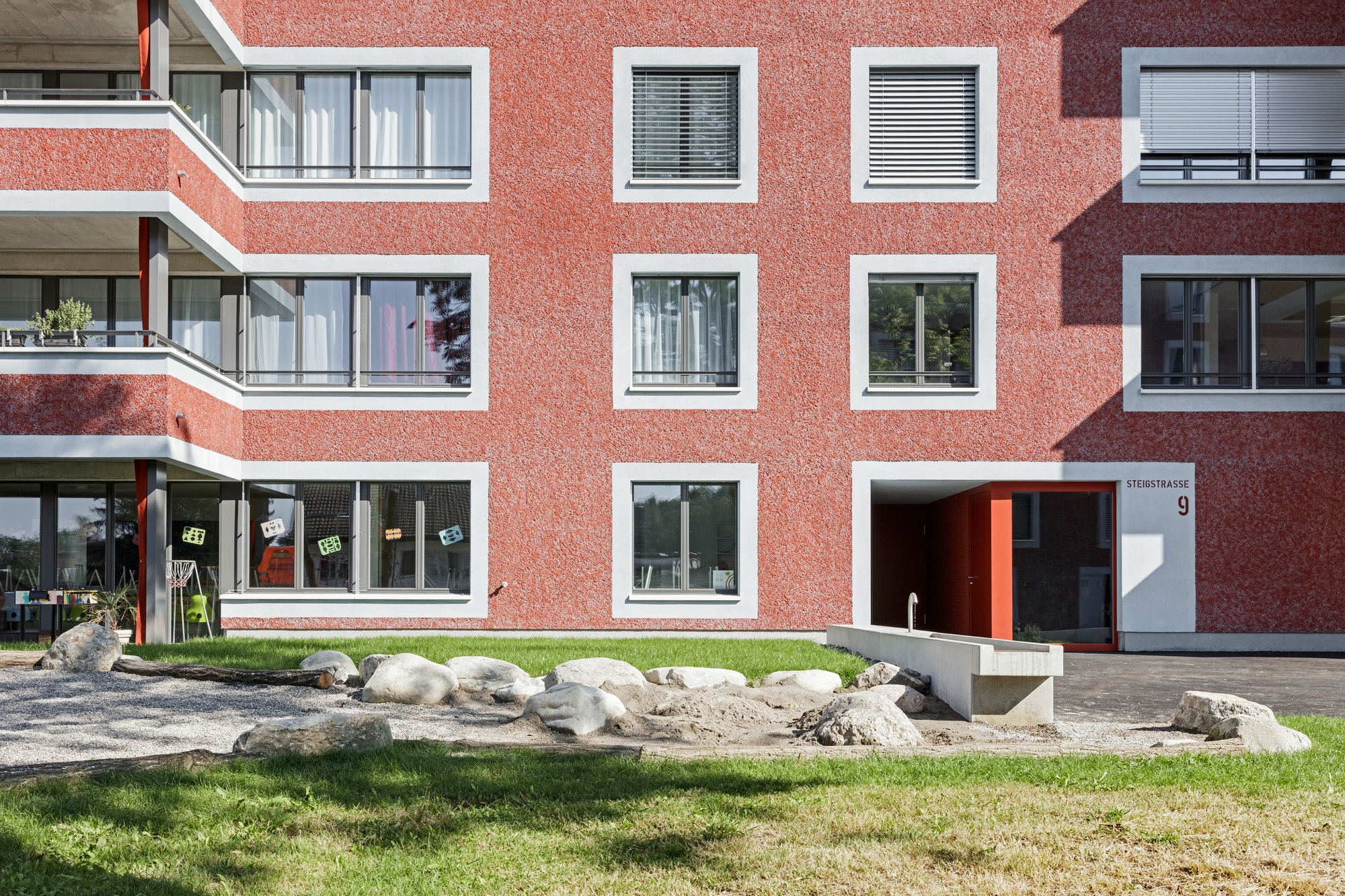The residential building “am Tämbrig” between Steigstrasse and Dorfweg consists of two buildings with 35 apartments in total. The higher building has five storeys and is slightly back staggered, while the smaller has only four storeys. The center of the housing estate is built by the yard with the major ash. The yard acts as living zone, playing area and has access to both entrances.