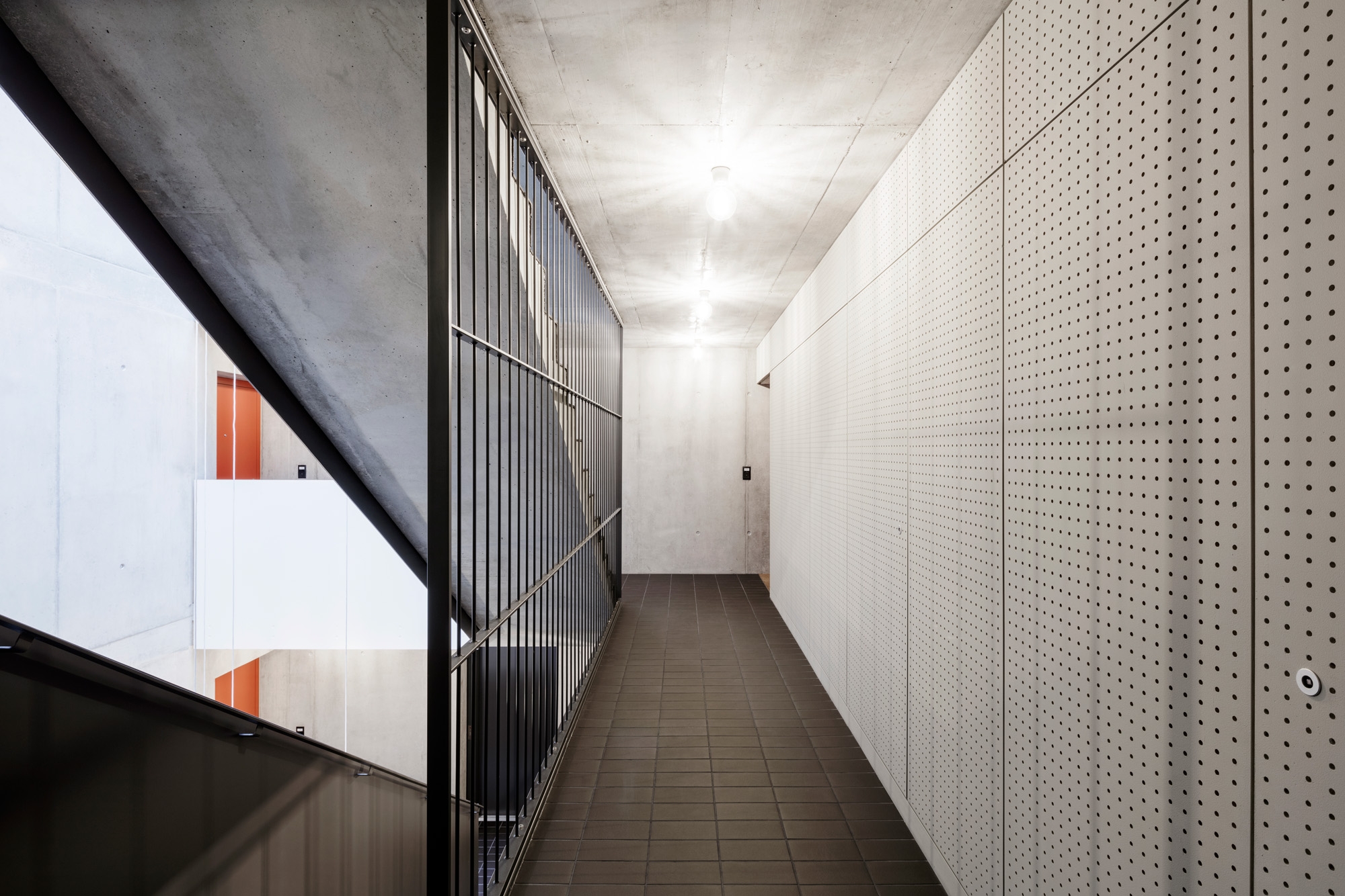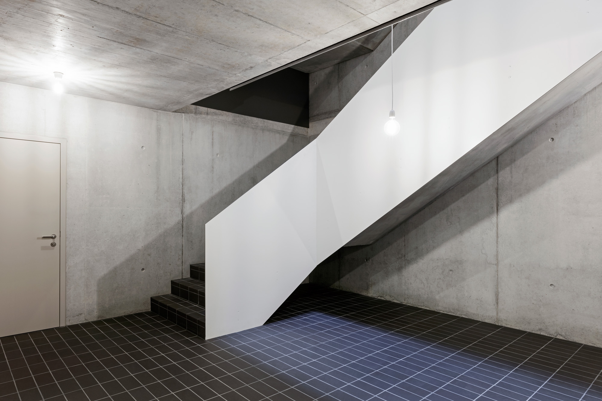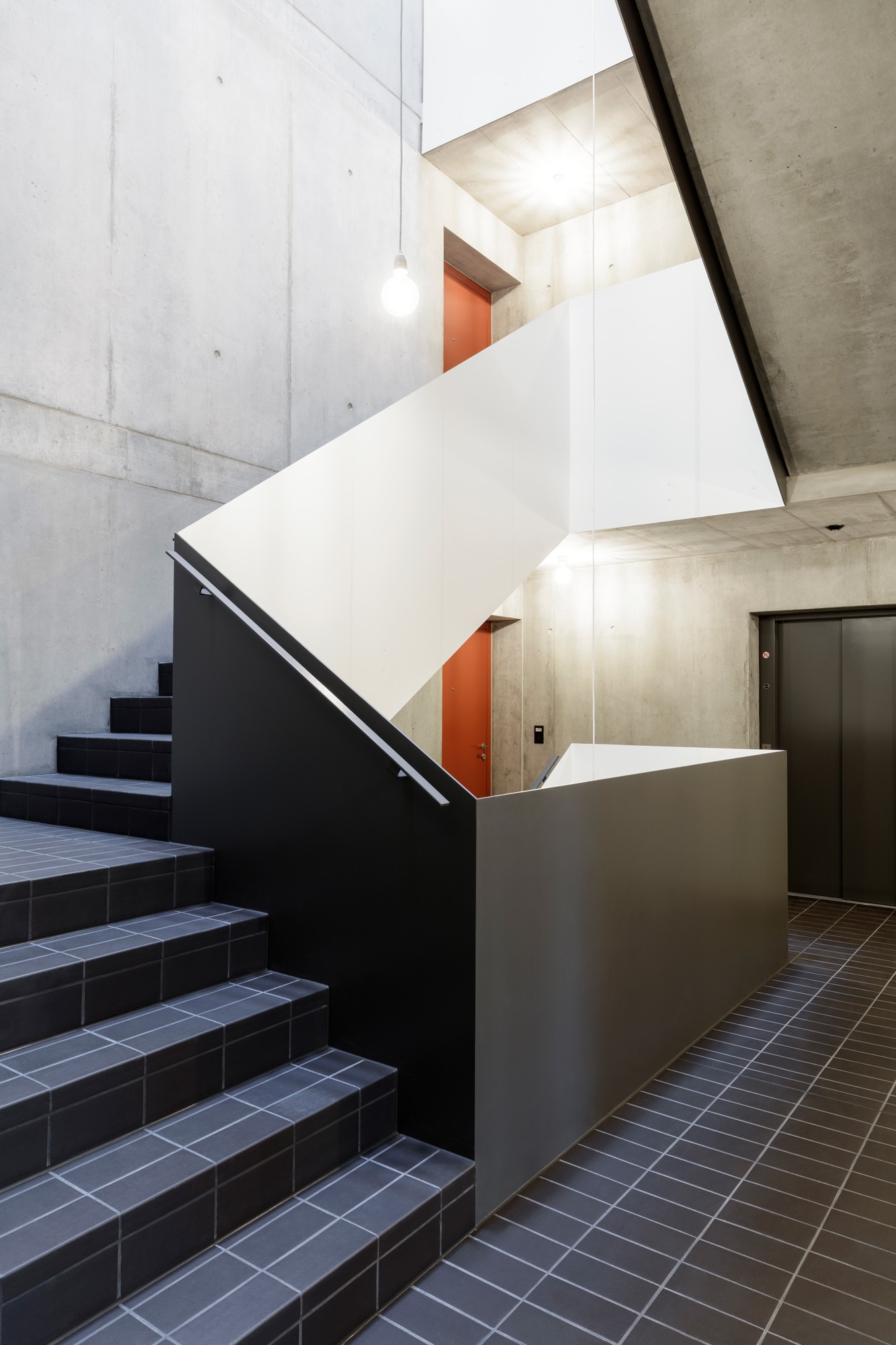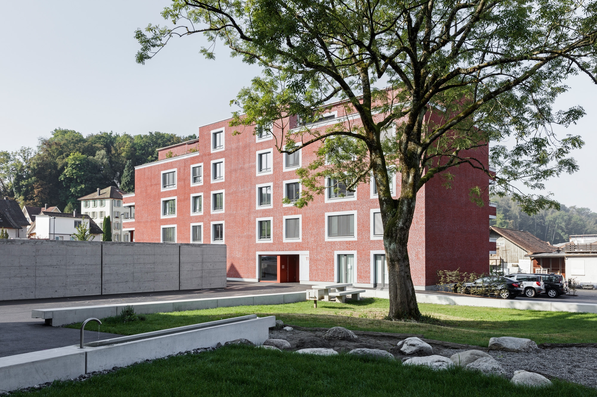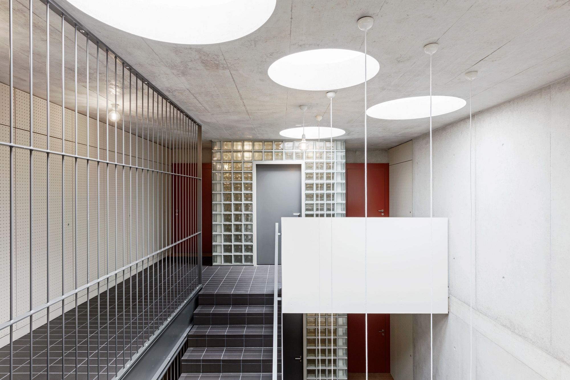 The bricked and plastered newly built houses orientate themselves on the historic and industrial affected buildings from Uster. The floor plan of the bigger House whit its 22 apartments and a day nursery is divided into four parts. On each storey there is a washroom, embraced by glass bricks, which is shared by the four parties on the same floor. On the one hand, this is very useful for the inhabitants on the other hand it makes the Staircase to a meeting point.
