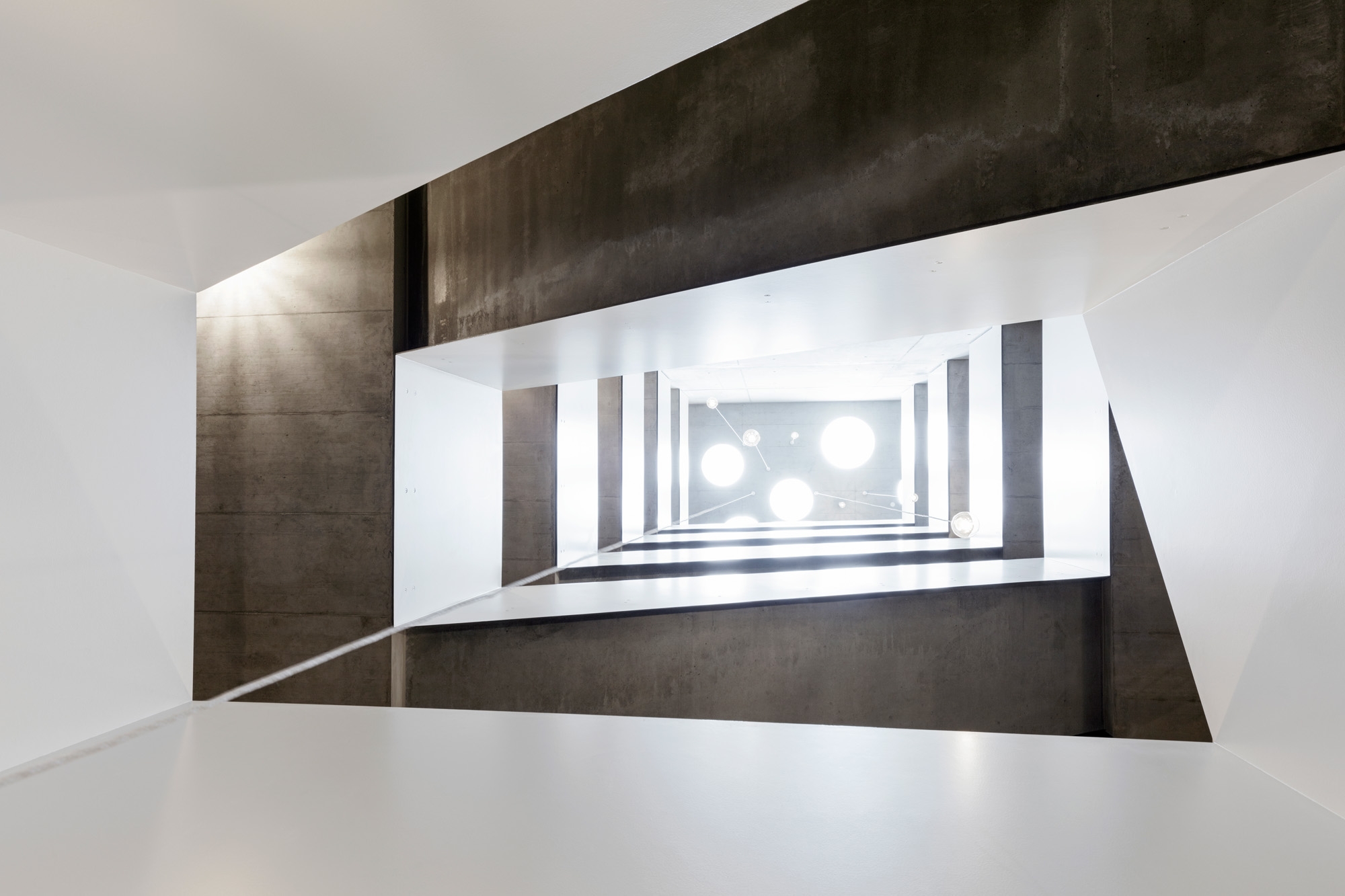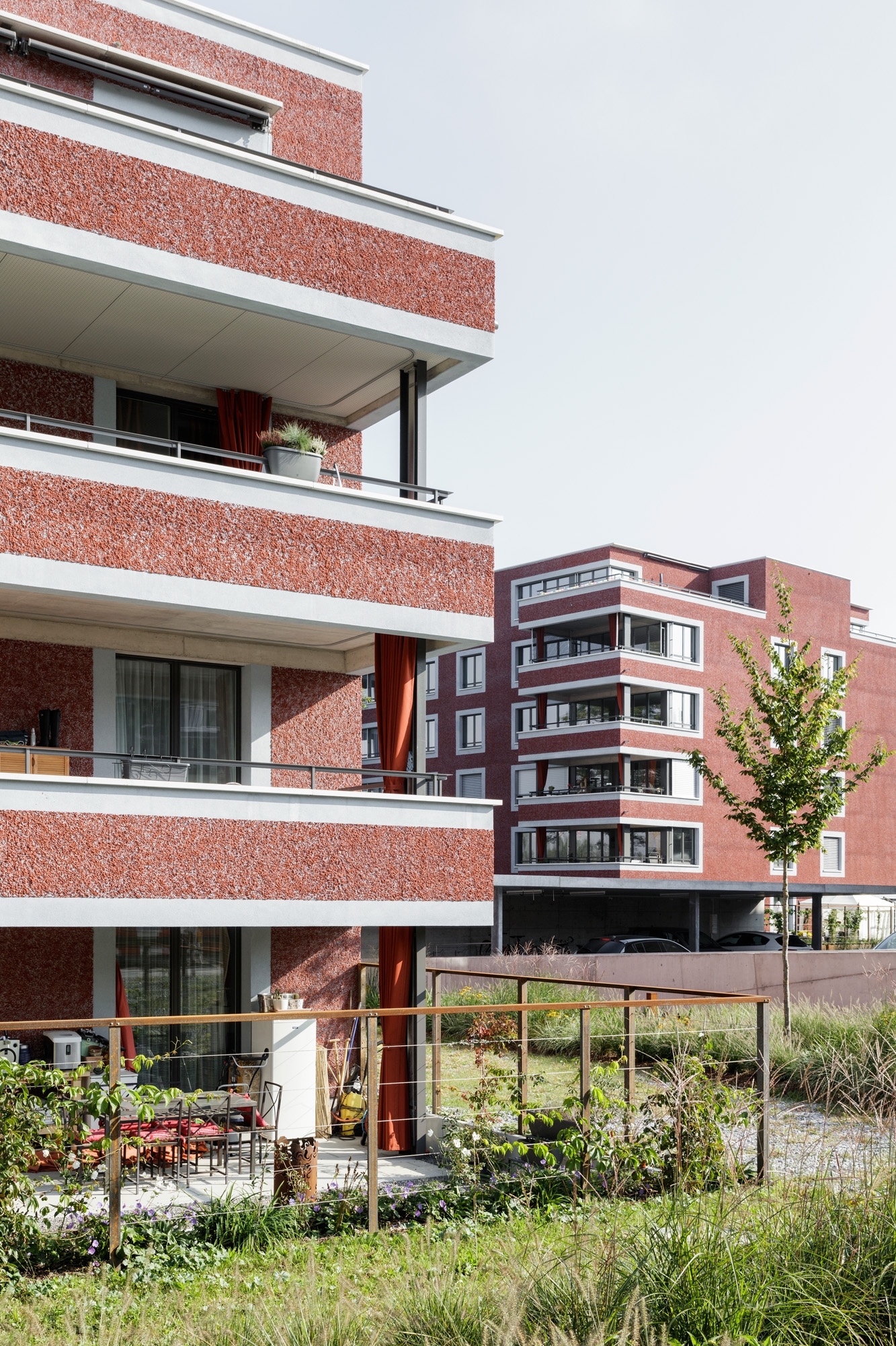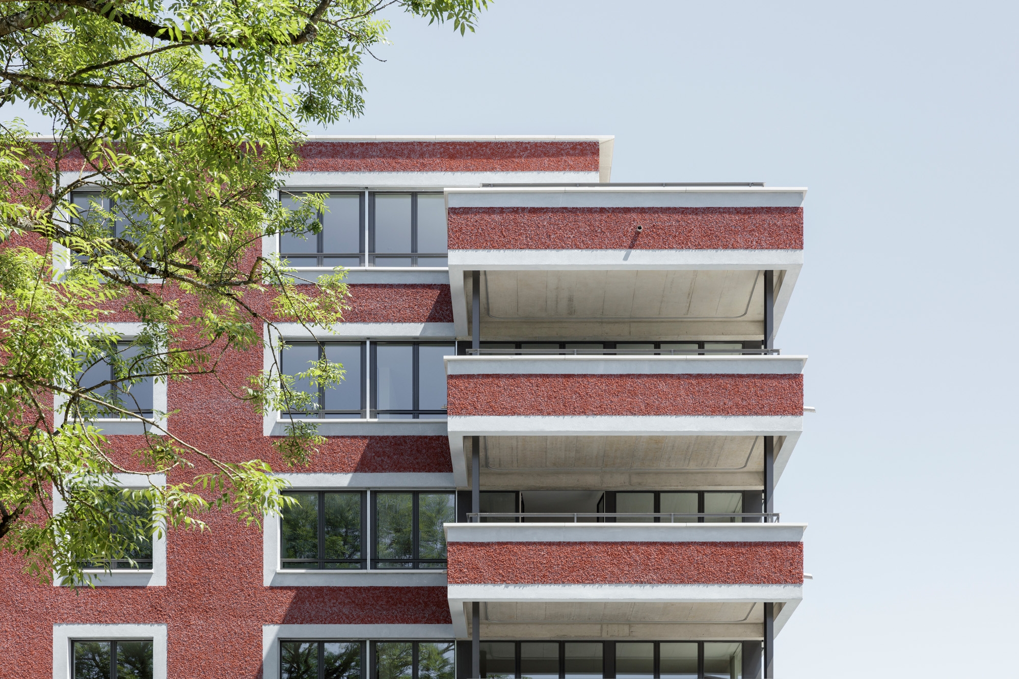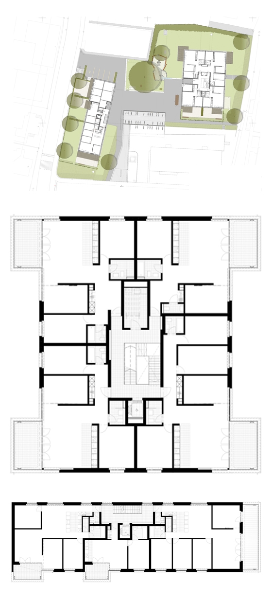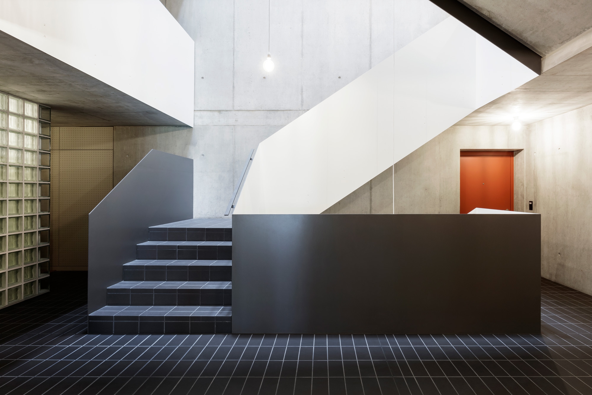 The bricked and plastered newly built houses orientate themselves on the historic and industrial affected buildings from Uster. The floor plan of the bigger House whit its 22 apartments and a day nursery is divided into four parts. On each storey there is a washroom, embraced by glass bricks, which is shared by the four parties on the same floor. On the one hand, this is very useful for the inhabitants on the other hand it makes the Staircase to a meeting point.