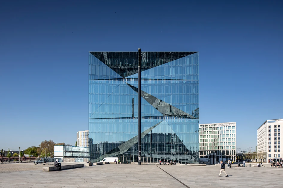 Located on the busy Washingtonplatz next to Berlin’s Central Station, the cleverly sculpted cube berlin is in the heart of the city’s business, government, and cultural district. With its prominent location, 3XN Architects of Copenhagen designed cube berlin to be a showstopping sculpture on the square. The all-glass design presented multiple challenges, including energy concerns and structural requirements. So a collaborative team that included the architects, owners, coatings experts, glass manufacturer, PVB experts, and facade consultants worked to resolve potential concerns.