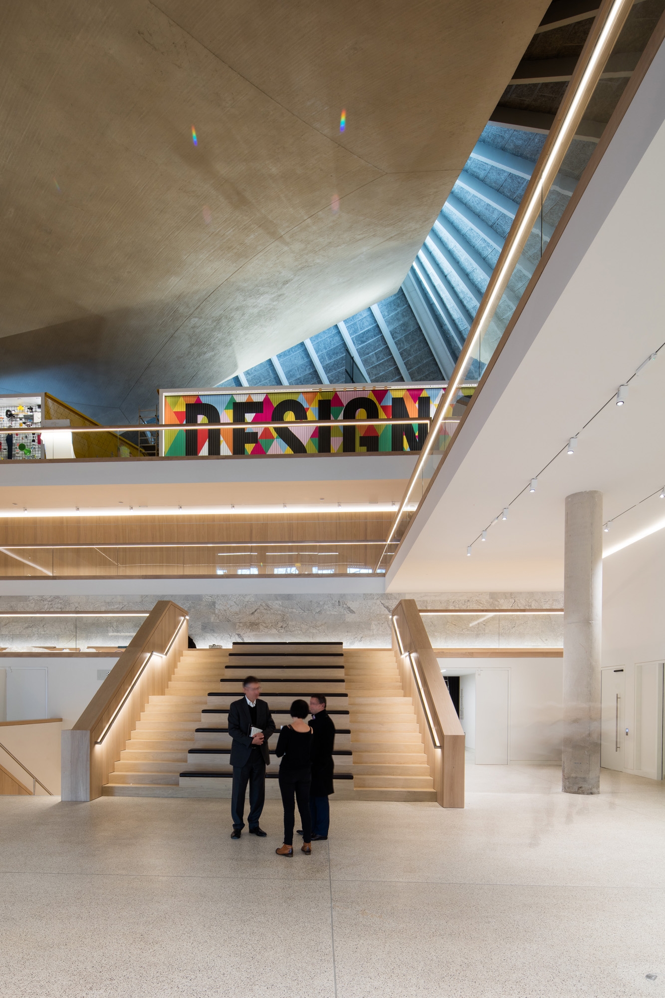 With architectural and structural expertise from OMA, Allies and Morrison and Arup, a permanent collection display designed by Studio Myerscough, a restaurant and members’ room by Universal Design Studio, a Centre for Learning made possible by the Swarovski Foundation, flooring by Dinesen, furniture by Vitra, shelving by Vitsoe, lighting by Concord, a visual identity by Studio Fernando Gutierrez and way-finding by Cartlidge Levene, the new Design Museum is an outstanding example of interdisciplinary collaboration.