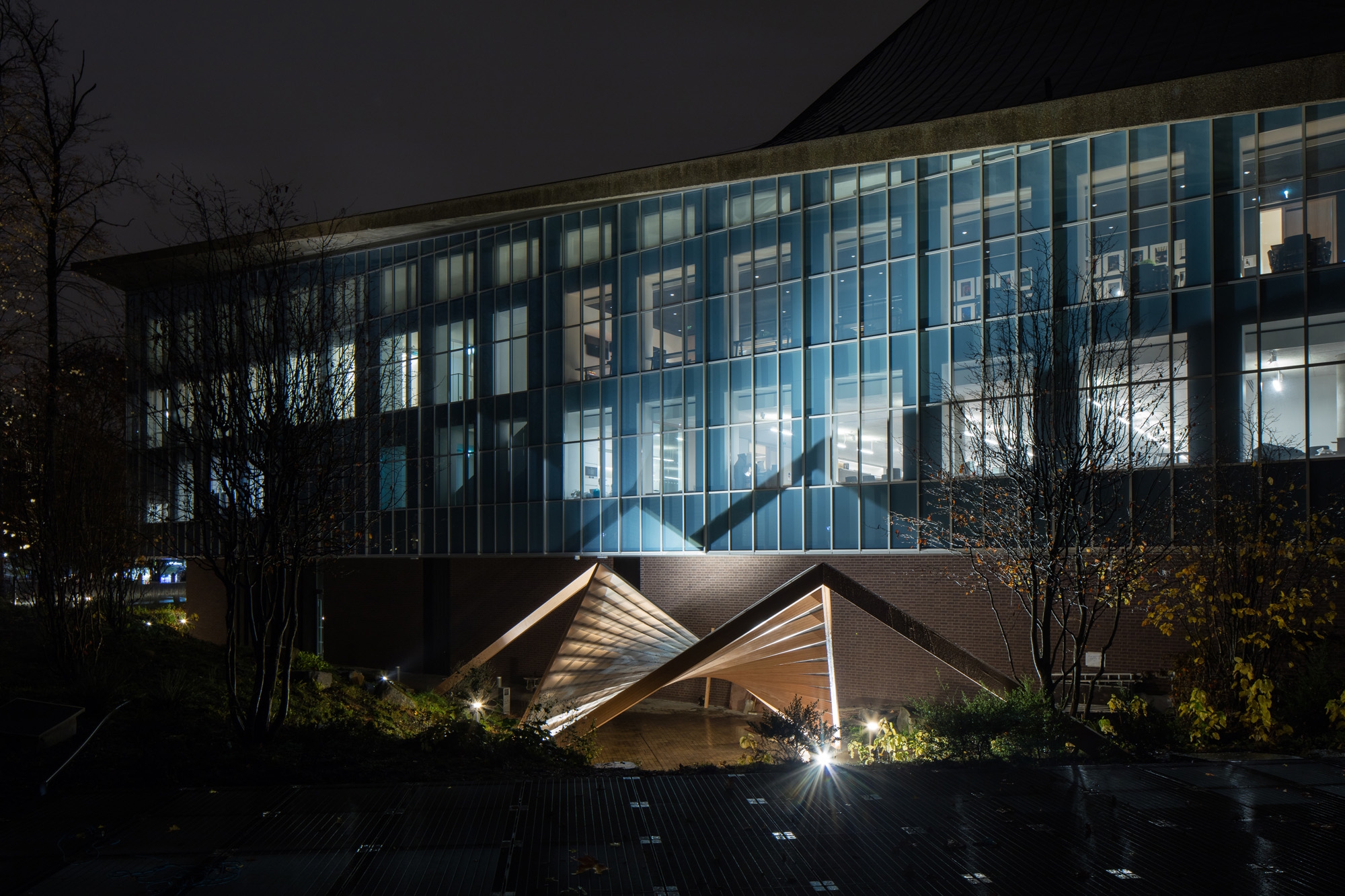 The new exterior has been meticulously detailed to resemble the original blue skin of the building, with matching mullions and a fritted pattern of printed dots. A new public plaza complete with fountains has been installed at the entrance to the museum, within a landscape designed by West 8.