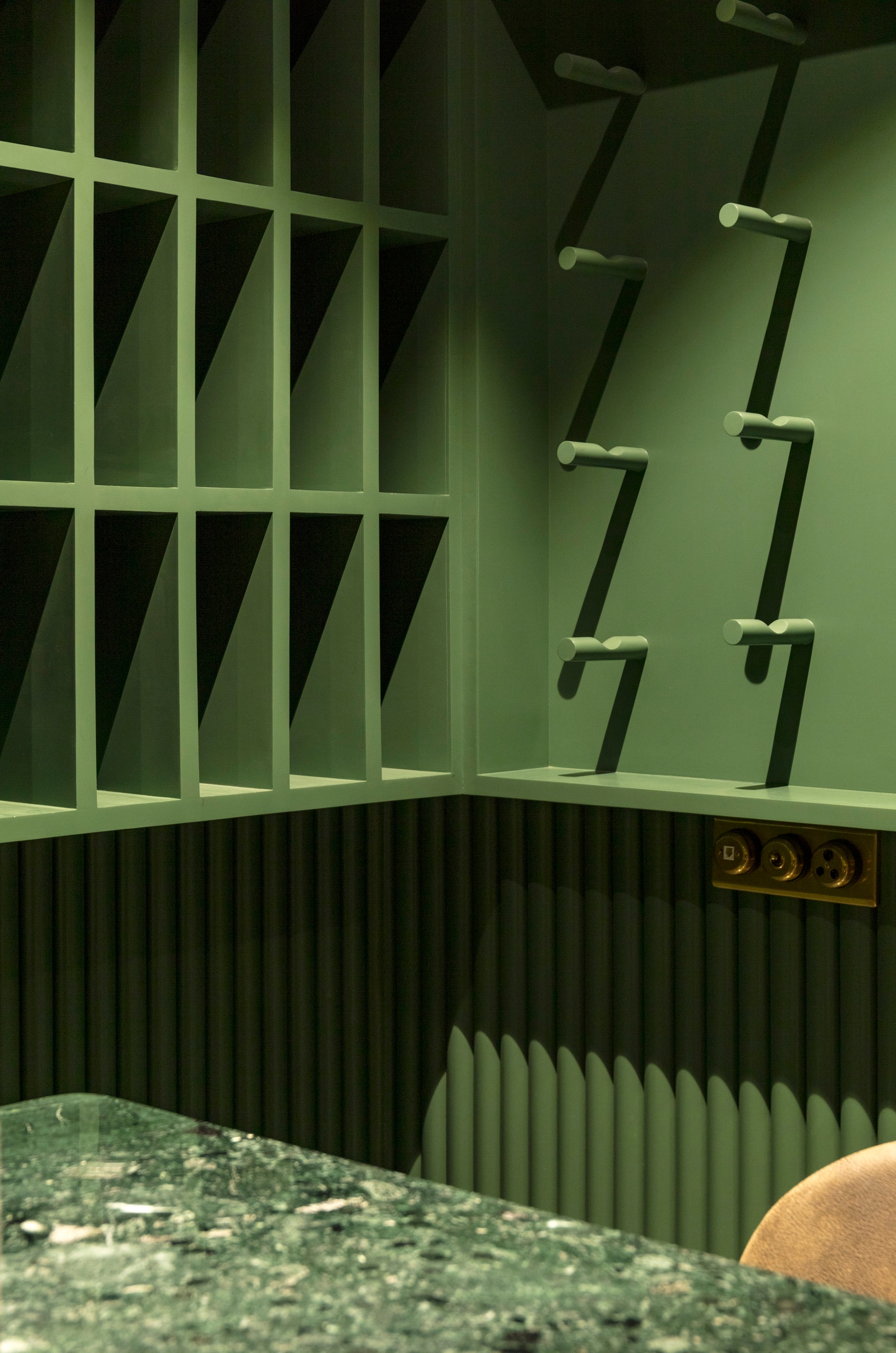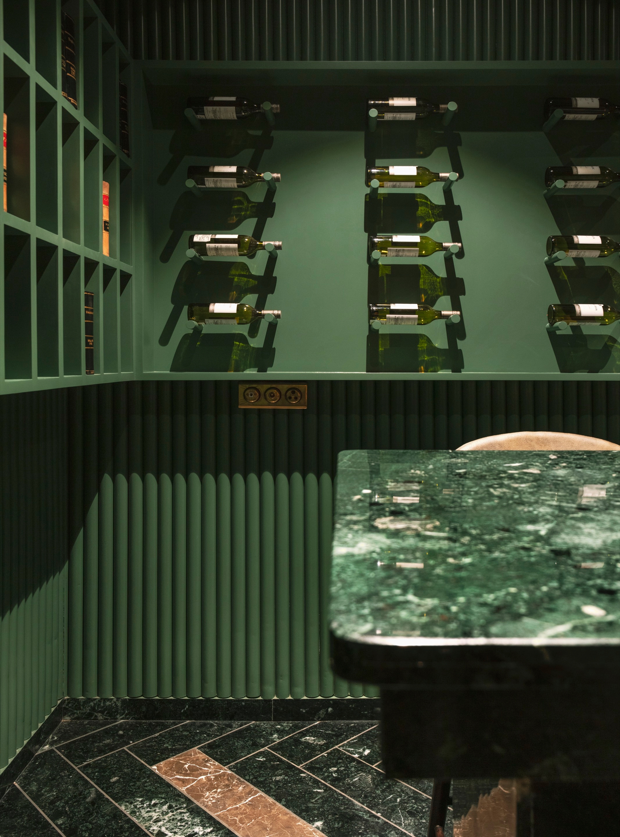Layers and design features encourage customers to explore the space. A small entrance leads to the winery with wine bottles integrated into shelving alongside the long fluted bar. Amidst the wine bar, we decided to provide a community table clad in greenstone and high chairs.