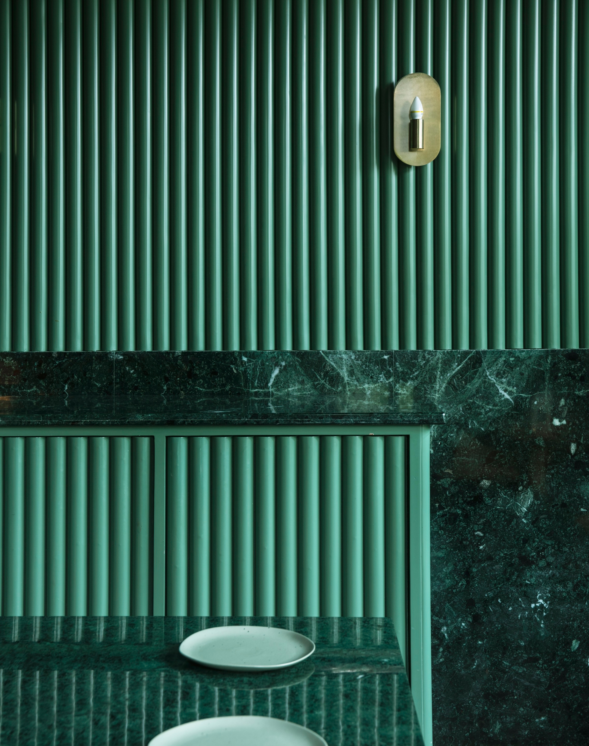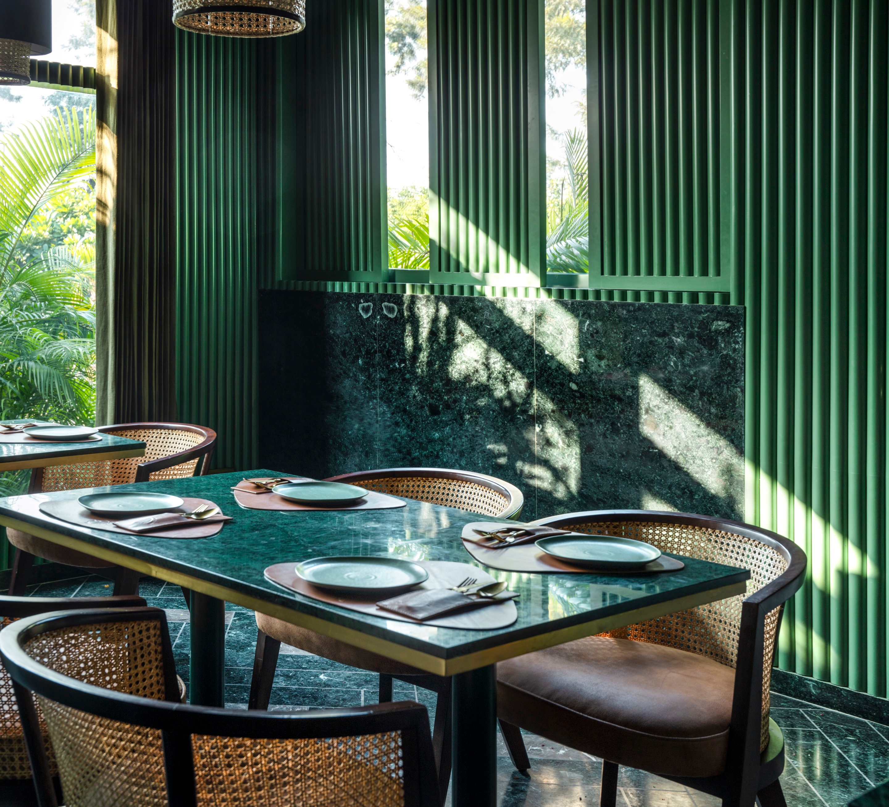 Approaching the design through locally sourced materials, the entire space reflects Udaipur green stone with fluted members. You can spot nuances of Madagascar green and pale green with contrasting salmon color seating that adds a not-so-subtle quirk to our scheme.