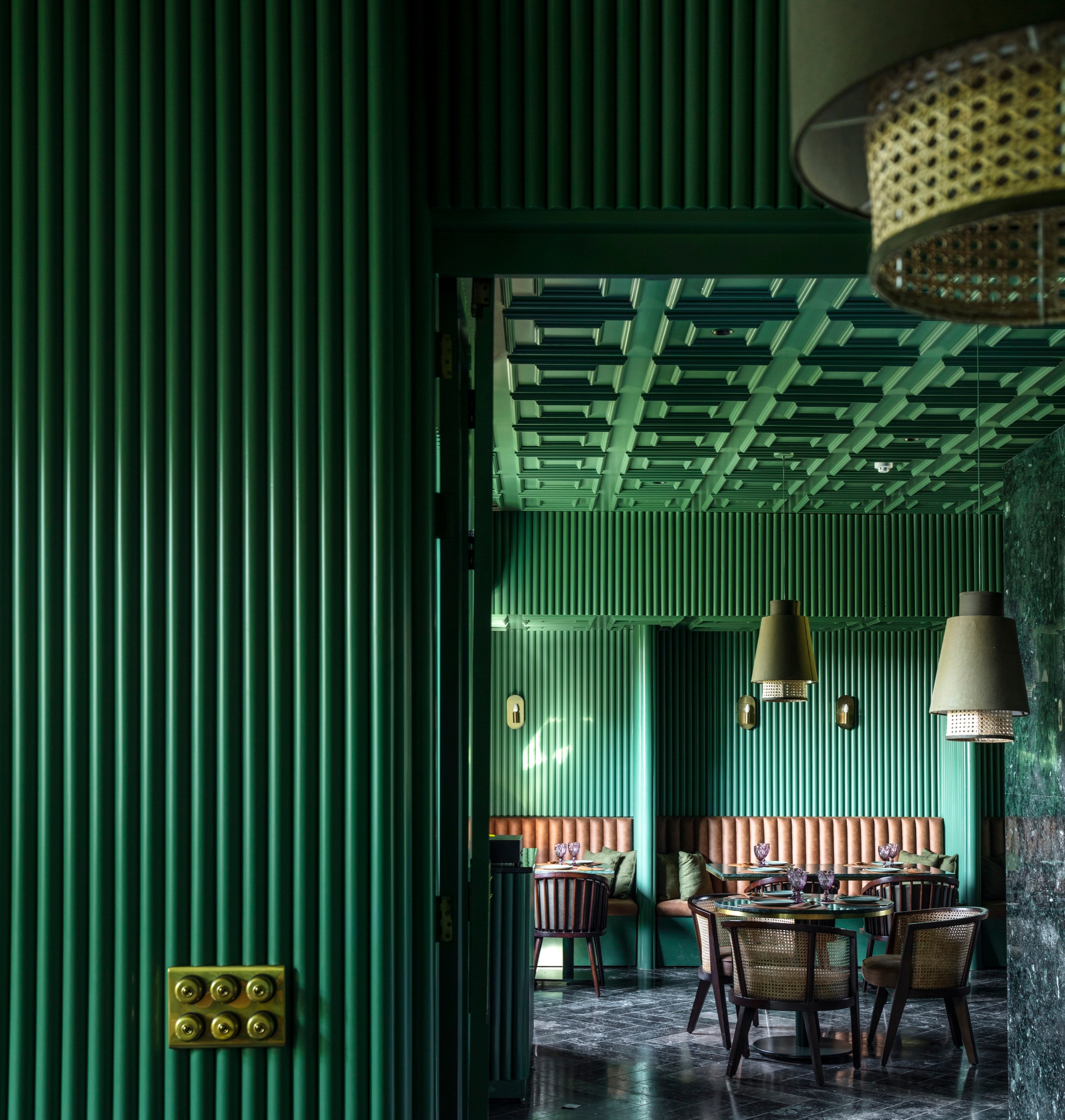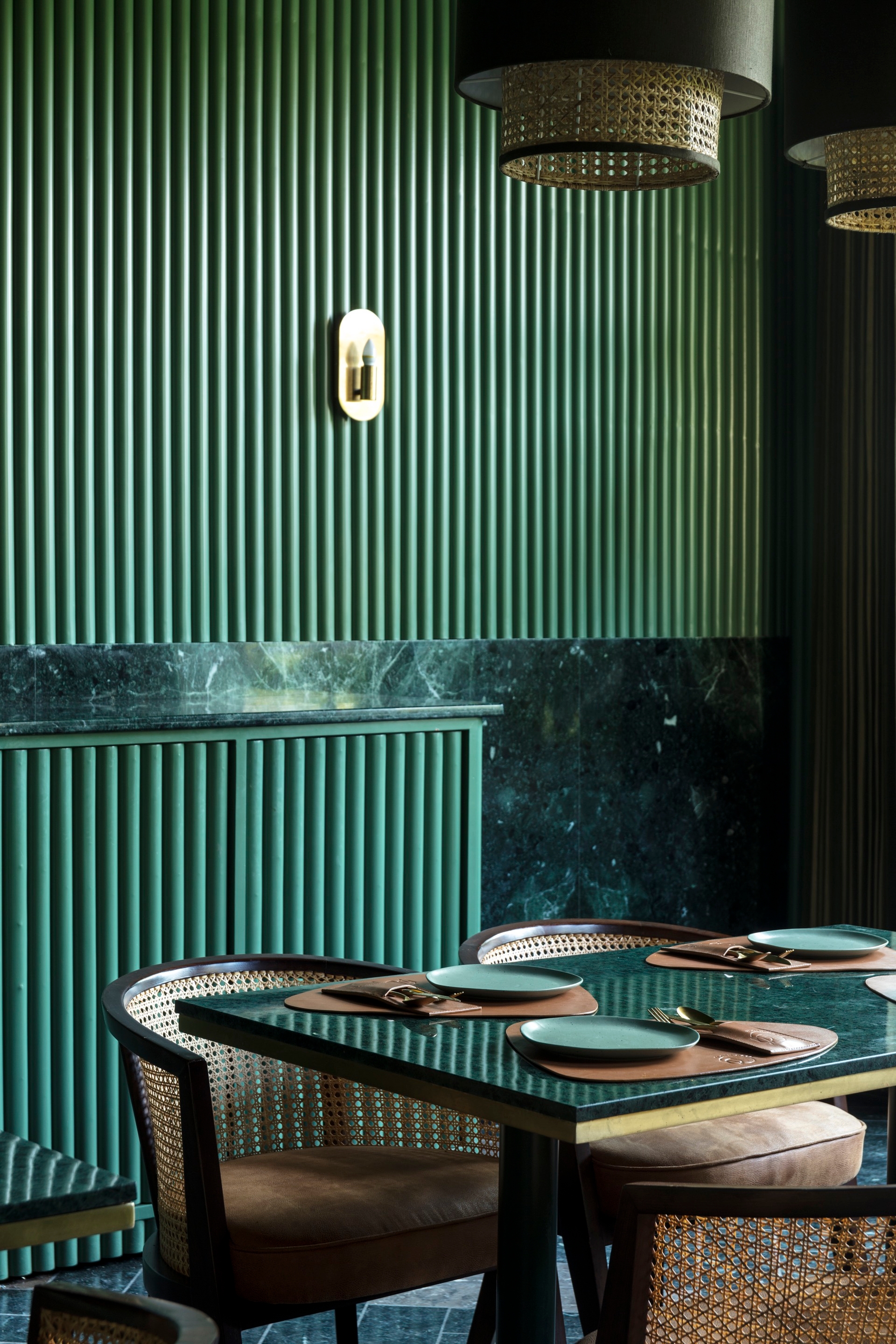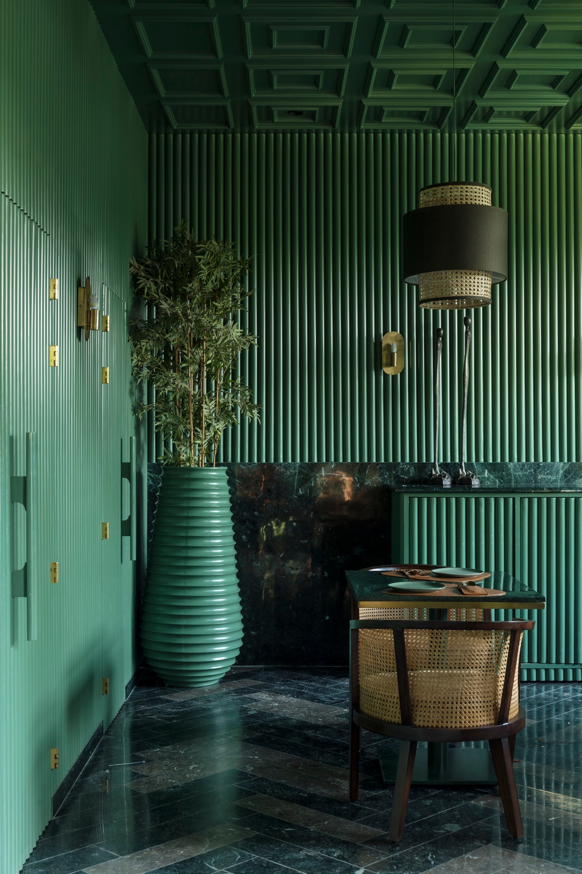 The theme, aesthetically curated with dark green and cane work, accentuated with golden details and a concealed wine bar, is not only functionally designed, but it becomes also a welcome card to the rest of the space.