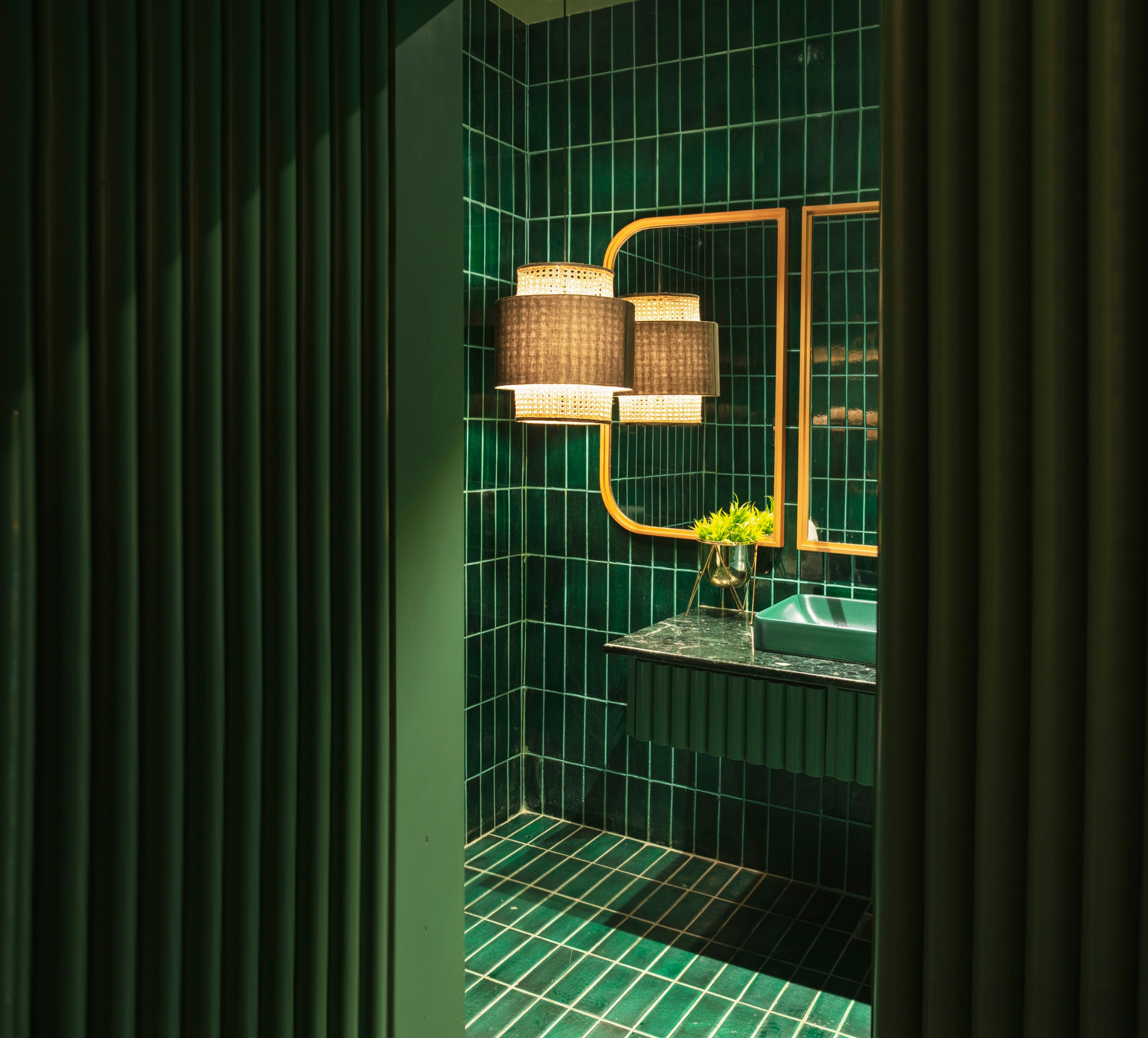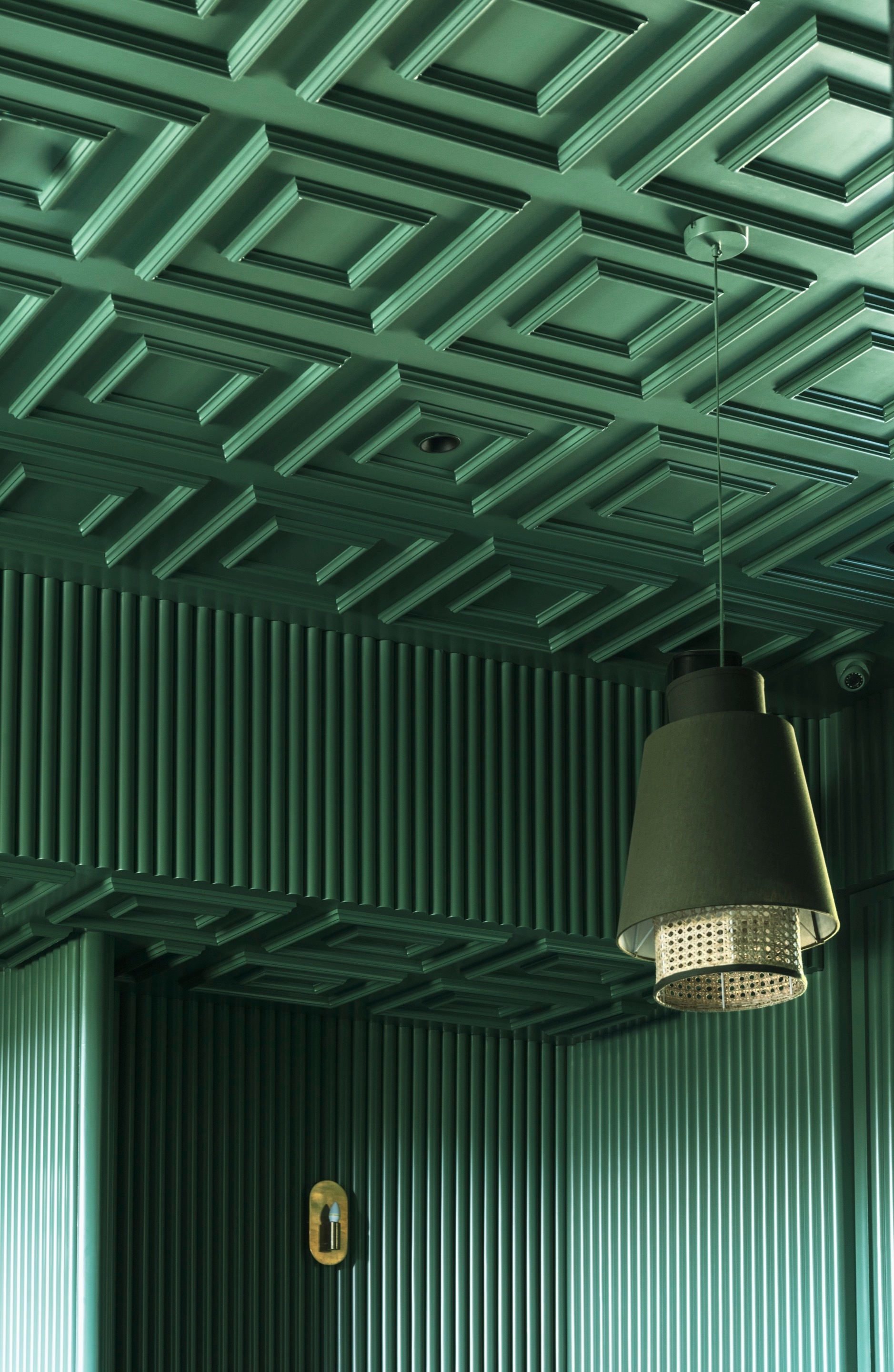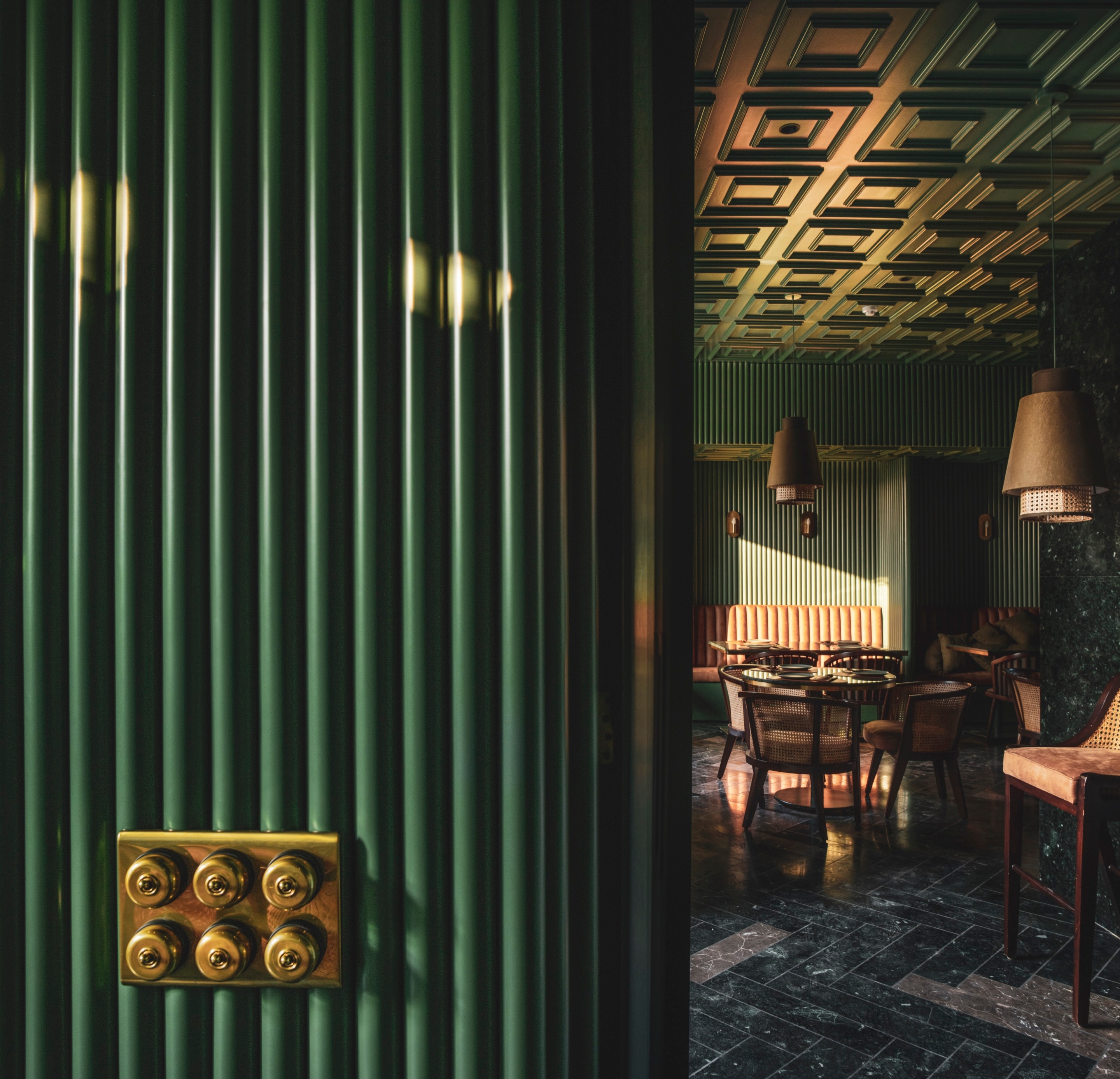 The theme, aesthetically curated with dark green and cane work, accentuated with golden details and a concealed wine bar, is not only functionally designed, but it becomes also a welcome card to the rest of the space.