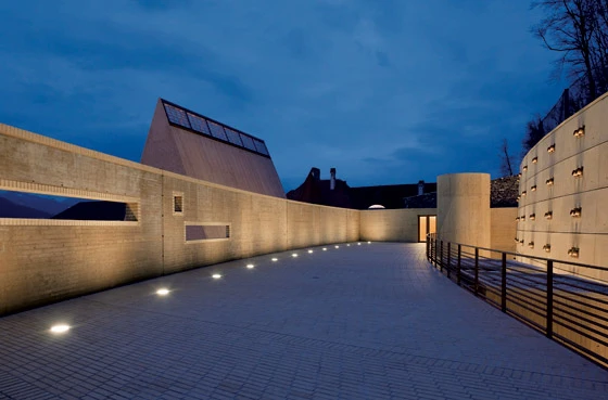 Protruding from the slope reinforcement wall are the faceplates of the ground anchors, forming a sort of relief. Almost inevitably they led to the idea of a luminous orchestration using intense grazing light. Through strongly directional in-ground luminaires the ground anchors cast long shadows on the wall. These have a dramatic plasticity which brings the lane between the wall and the Long House to life. The roof terrace of the Long House is flanked on one side by a softly illuminated wall facing the square and on the other by a play of light and shadow on the slope-reinforcing construction.