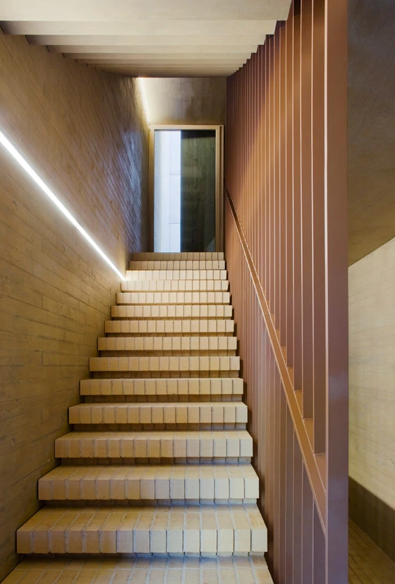 The Long House curving round the foot of the slope is characterised by the brises-soleils – columnar brick louvers positioned in front of the window façade in order to control the incidence of solar radiation and to frame the building towards the square. Illuminated at night by floor-recessed luminaires, these sun screen elements become reflective surfaces, resulting in a distinctive rhythmic contrast between strips of light and shadow.