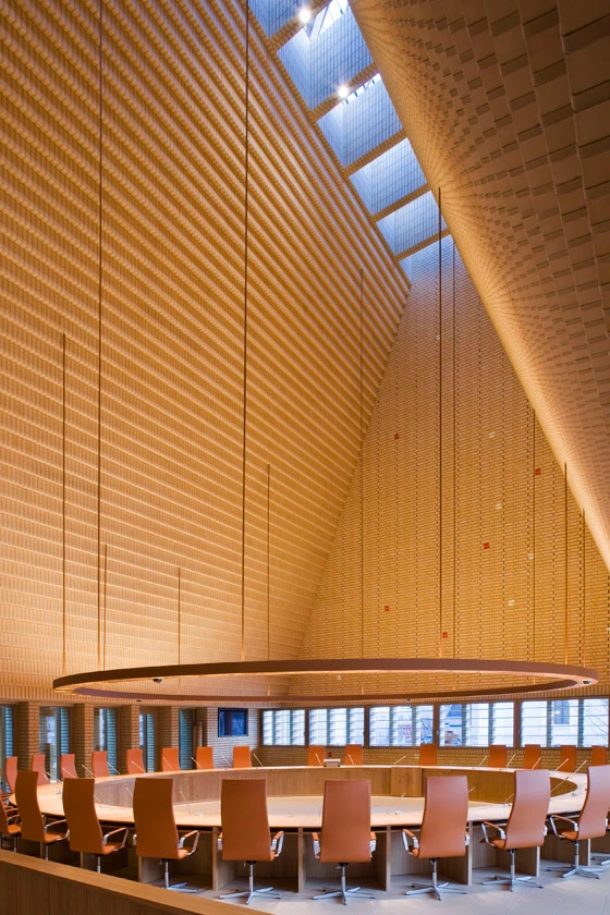 In the parliamentary assembly hall, the architect’s idea has evolved into an archaic shape and an almost theatrical atmosphere. Located above a columned hall on the ground floor, the assembly hall with its 18-metre-high pitched roof of yellow brick is evocative of the Round Table. At first glance the room looks like a film set by Ken Adams. So it comes as no surprise that the large chandelier with its diameter of 9 metres has about it something of the style of the legendary set designer. The point of departure at the brainstorming sessions on the lighting for the assembly hall was, however, its almost church-like impression. A first approach foresaw small, individual pendant luminaires of the sort often seen in church naves. But when it emerged that the hall would require cameras and microphones for online coverage, the large circular chandelier proved to be the better option since it could inconspicuously integrate the necessary technical modules.