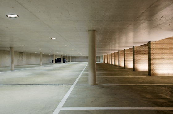 Far from the usual convoluted array of technical service channels, the ceiling of the underground car park is characterised by a calm, smooth concrete surface, perforated only by flush-mounted recessed downlights and downlight wallwashers. This general illumination, unusually brilliant for underground parking facilities, is supplemented by a warm white highlighting of the brick wall niches by means of linear lighting profiles.