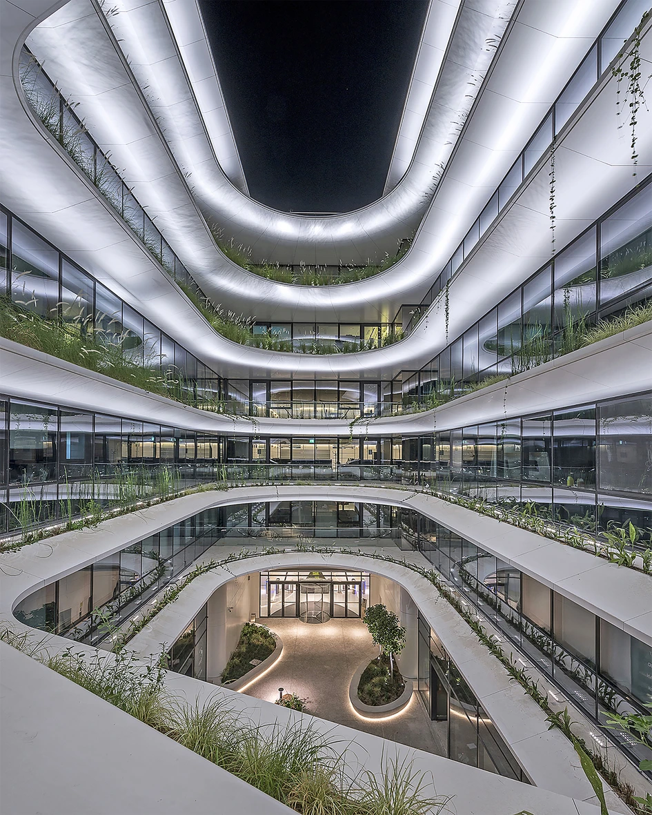 These white smooth ribbons, which run along with the building, create a strong and iconic silhouette, while they provide solar shading protecting it from the local hot climate.
