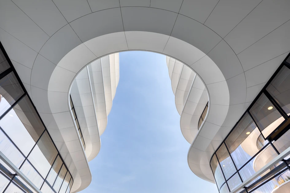 The design connects and unifies all elements, creating a dynamic yet elegant silhouette. The façade is consisted of the glazing parts and from the white striations made of white stain/pollution resistant etalbond® aluminium composite panels.