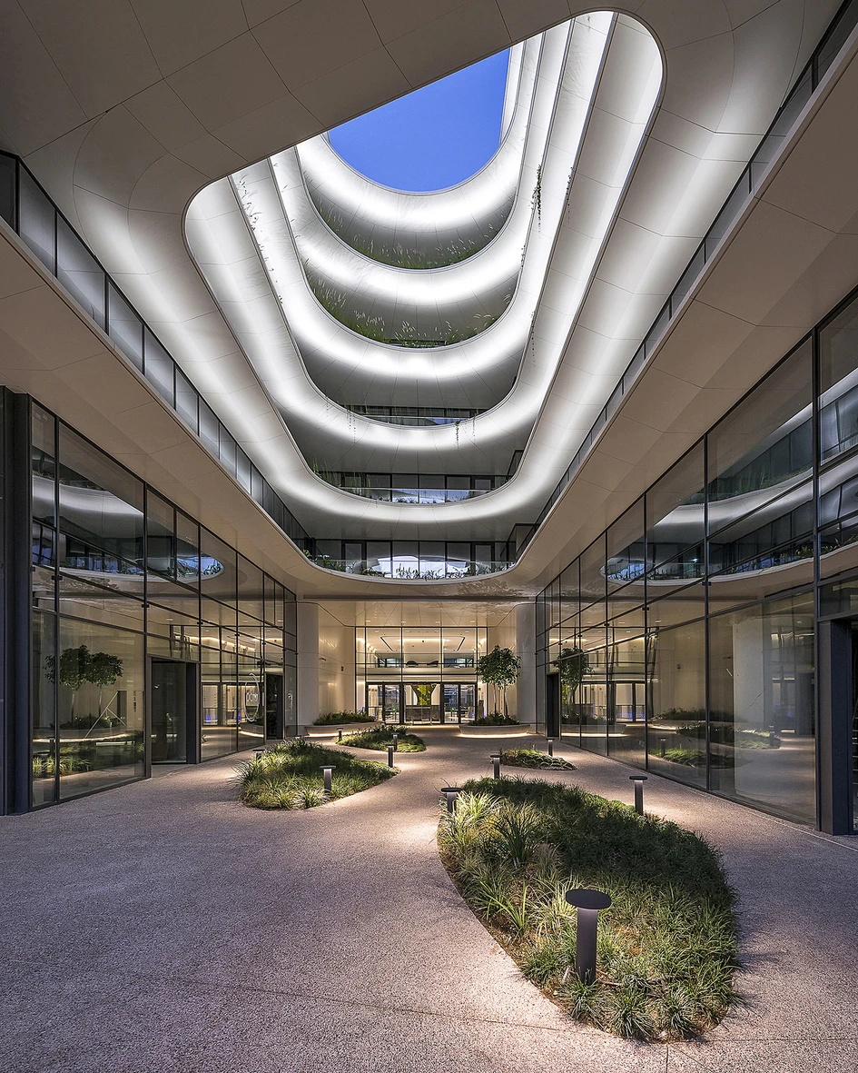 The facade was designed specifically for this area taking into consideration the local conditions. Thus, each side of the façade has different characteristics, where in some areas there are solid canopies or bridges and in other areas where there is need for more natural light, the façade folds back and by using perforated mesh surfaces the gains are increased thus the internal daylight is maximised, even to the lowest levels of the building.