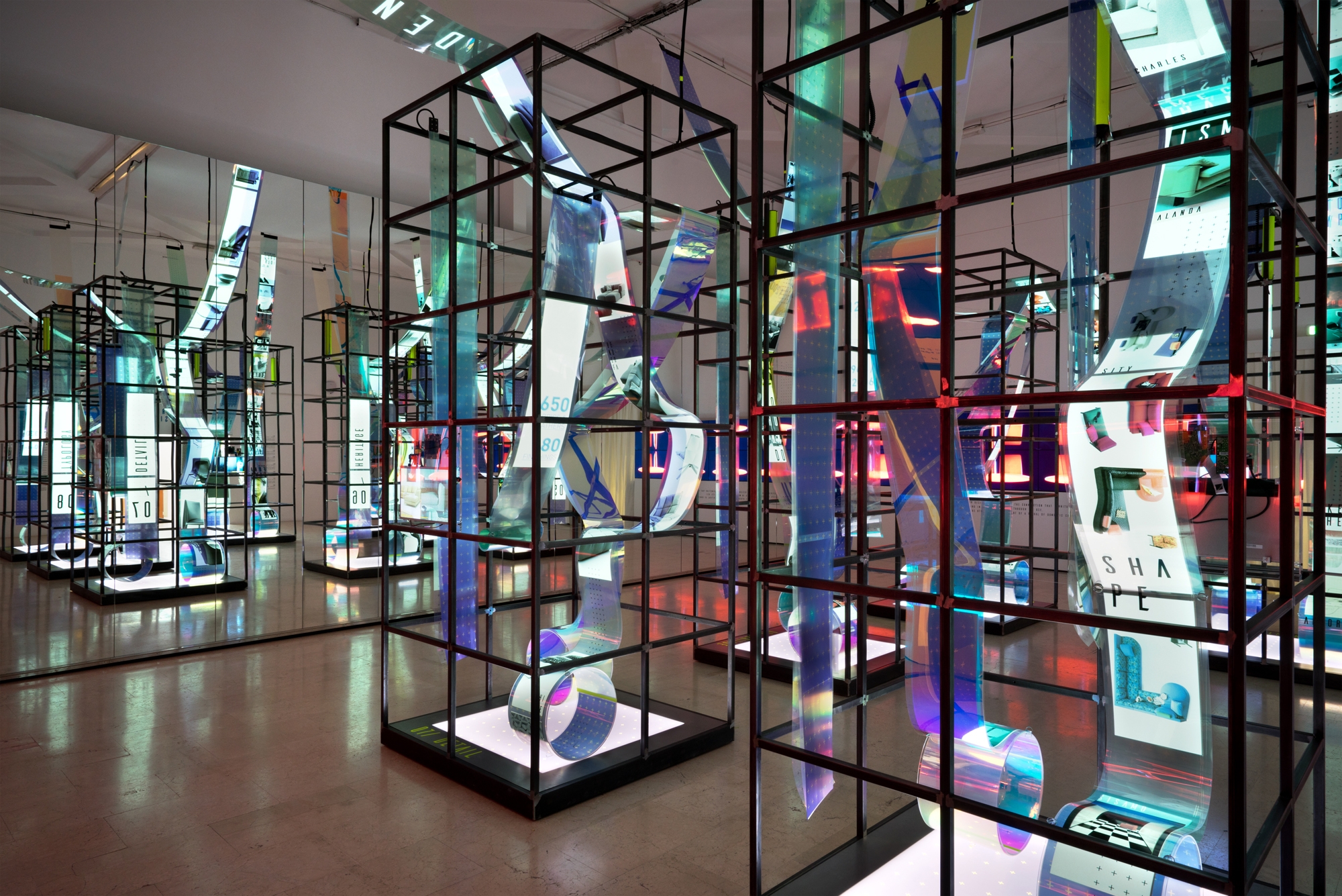 At the centre of space 8 high vertical cages, pulsating and in movement, create a weave of bright beams that project into the room images and texts, tracing out a system of allusions and suggestions among the various elements. A big brain, whose synapses, shaken by light pulses, surround the visitor in an ongoing and layered tale. Further insight is then provided by the 8 themed towers, which offer 8 different narrative videos. Two continuous bands scroll across the Impluvium’s side walls, revealing an environmental video consisting of a sum of micro-stories: images of graphics, products, people who over time have helped to build the brand’s excellence, and whose faces and gestures are reproduced to infinity by a system of mirrors.