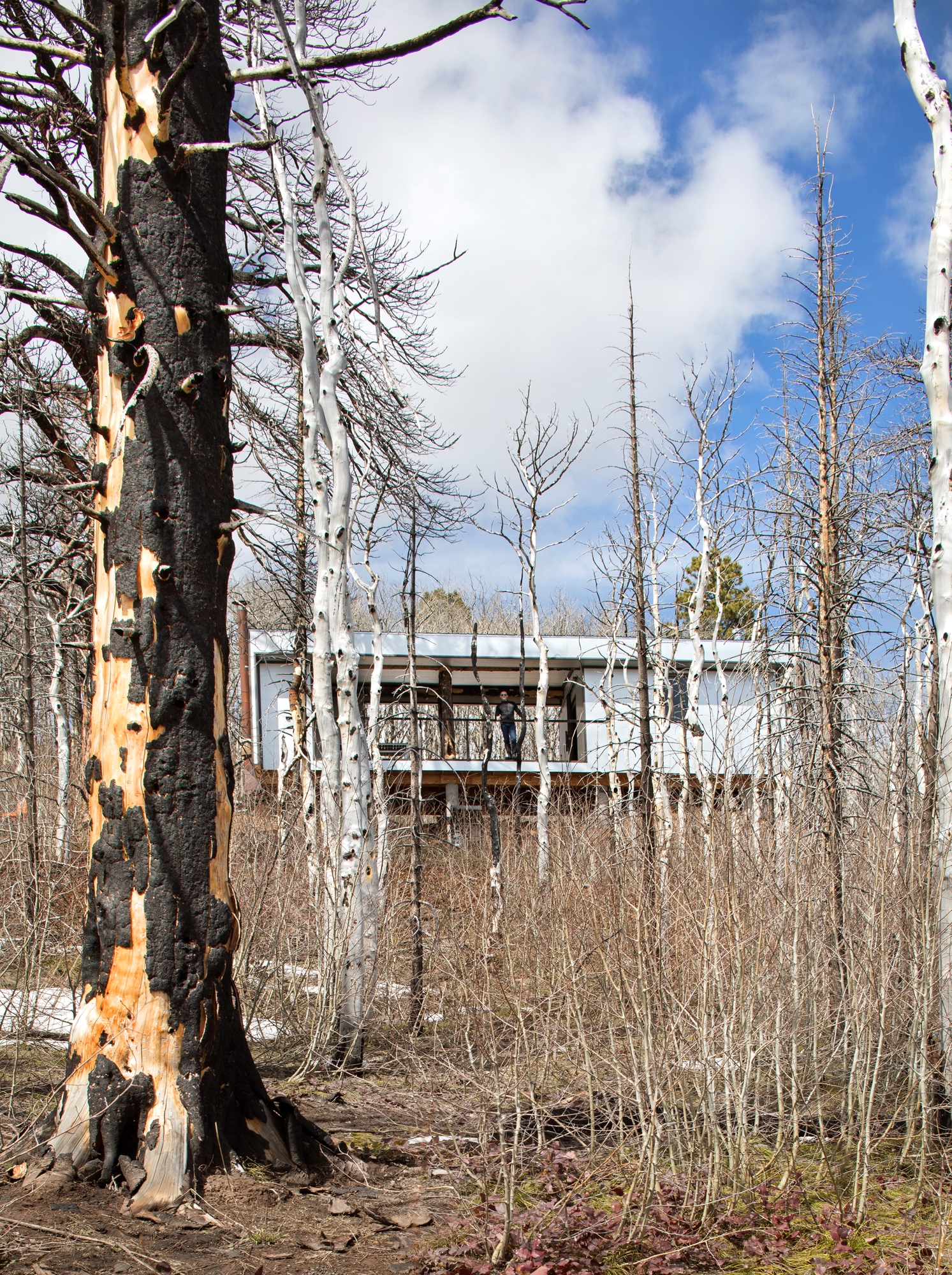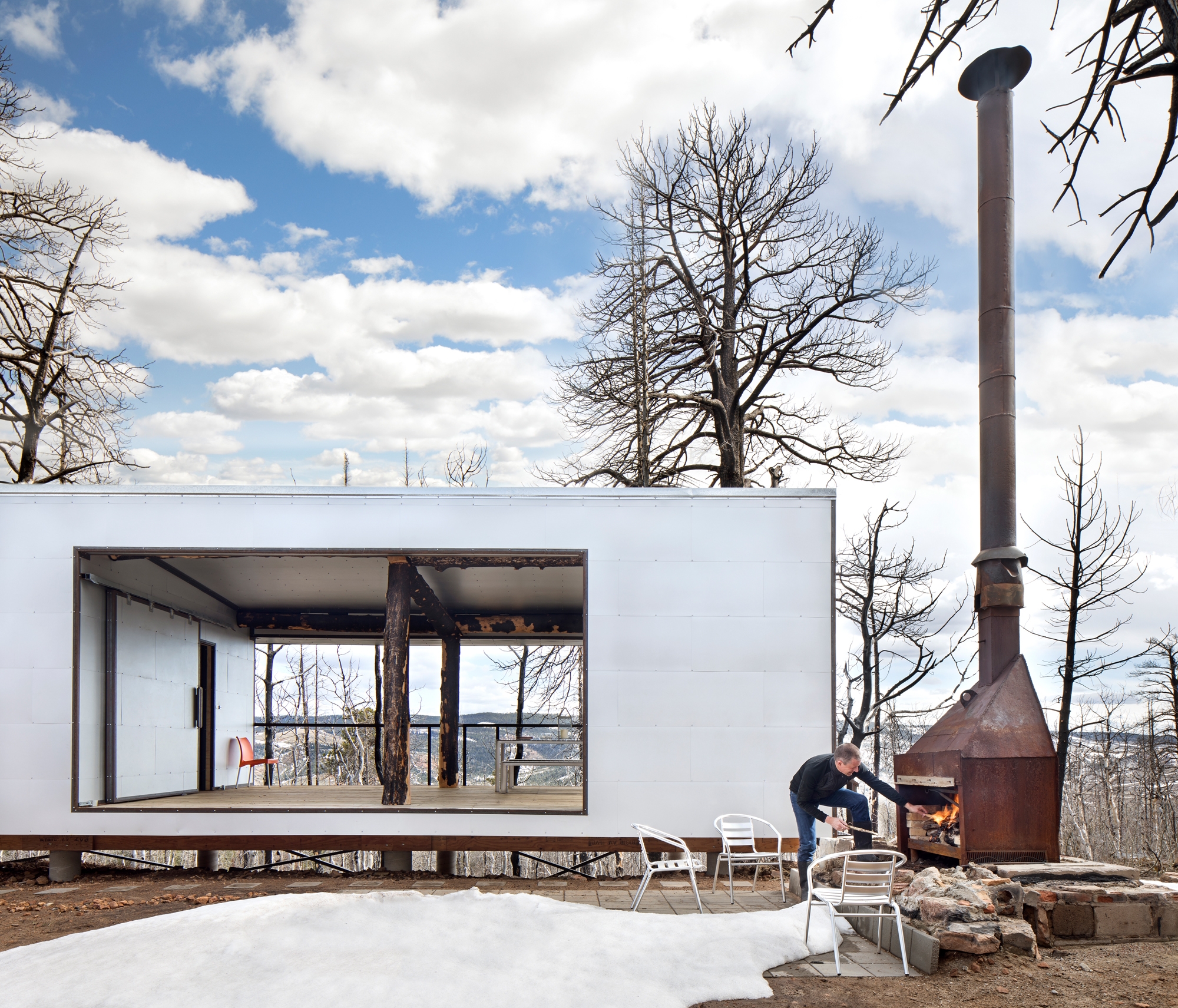 The new building is organized in open and closed zones: the open porch enjoys access to dramatic views of the landscape framed via simple rectangular openings in the galvanized building shell. The closed zone provides shelter, a wood stove for warmth and meal preparation and storage of necessities. Standing dead charred timber was incorporated in the structural system to connect the new building with the forest and to create a lasting reminder of the story of this place…The Phoenix has risen.