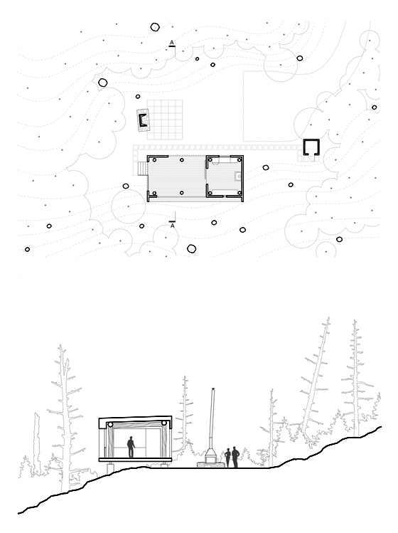 The new building is perched at the edge of the old building pad, touching the slope very lightly and creating an edge for the court where the old building stood. The ruins of the old fireplace were retained for memory, to create a vertical marker for the site, and as a gathering point around an outdoor fire.