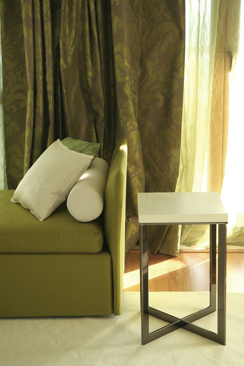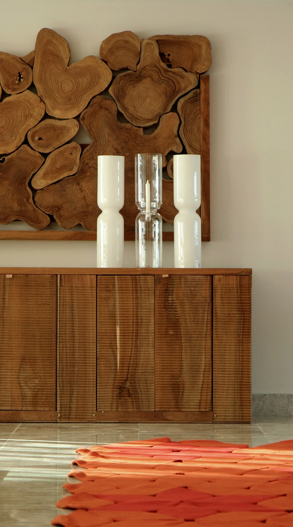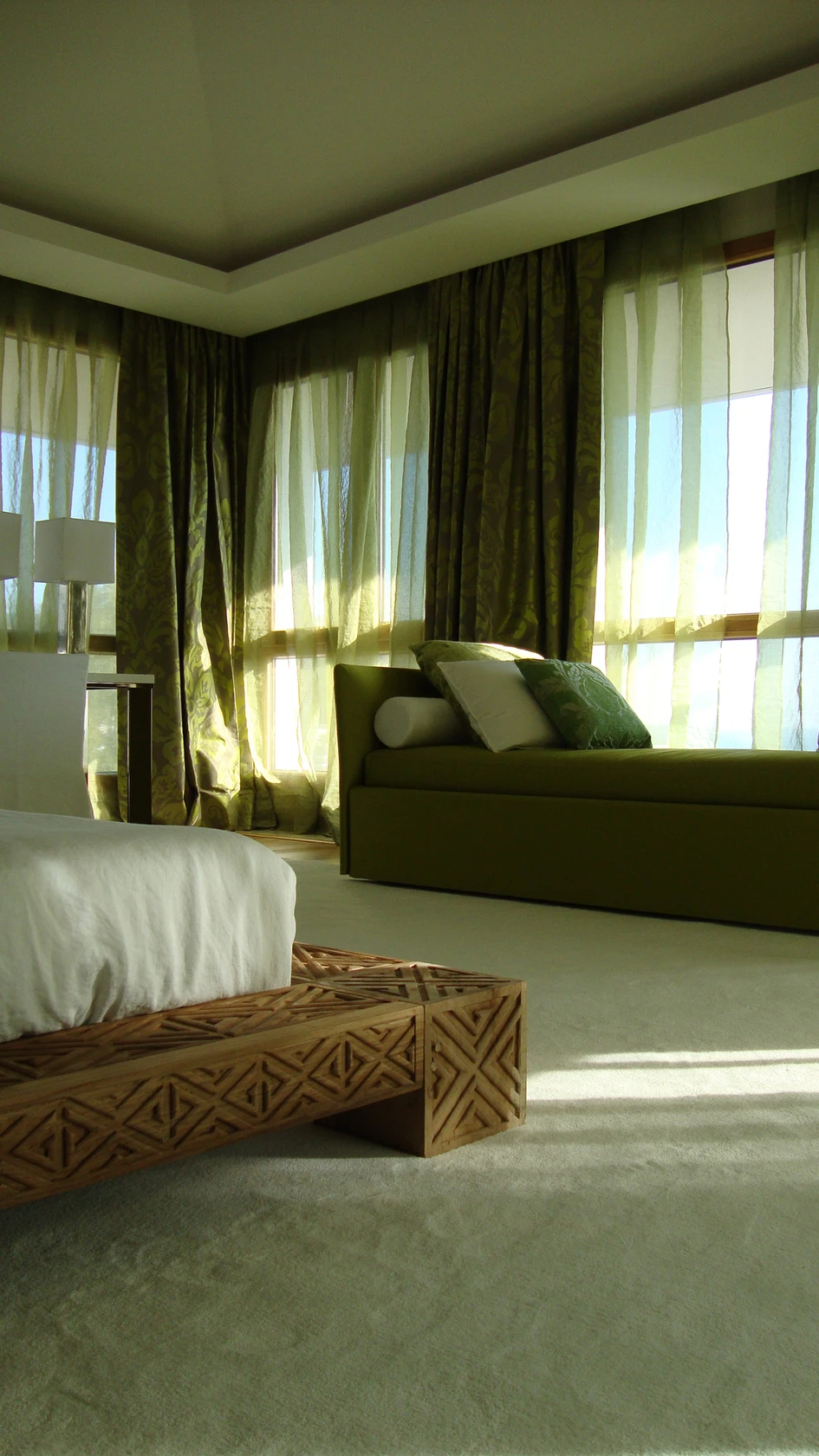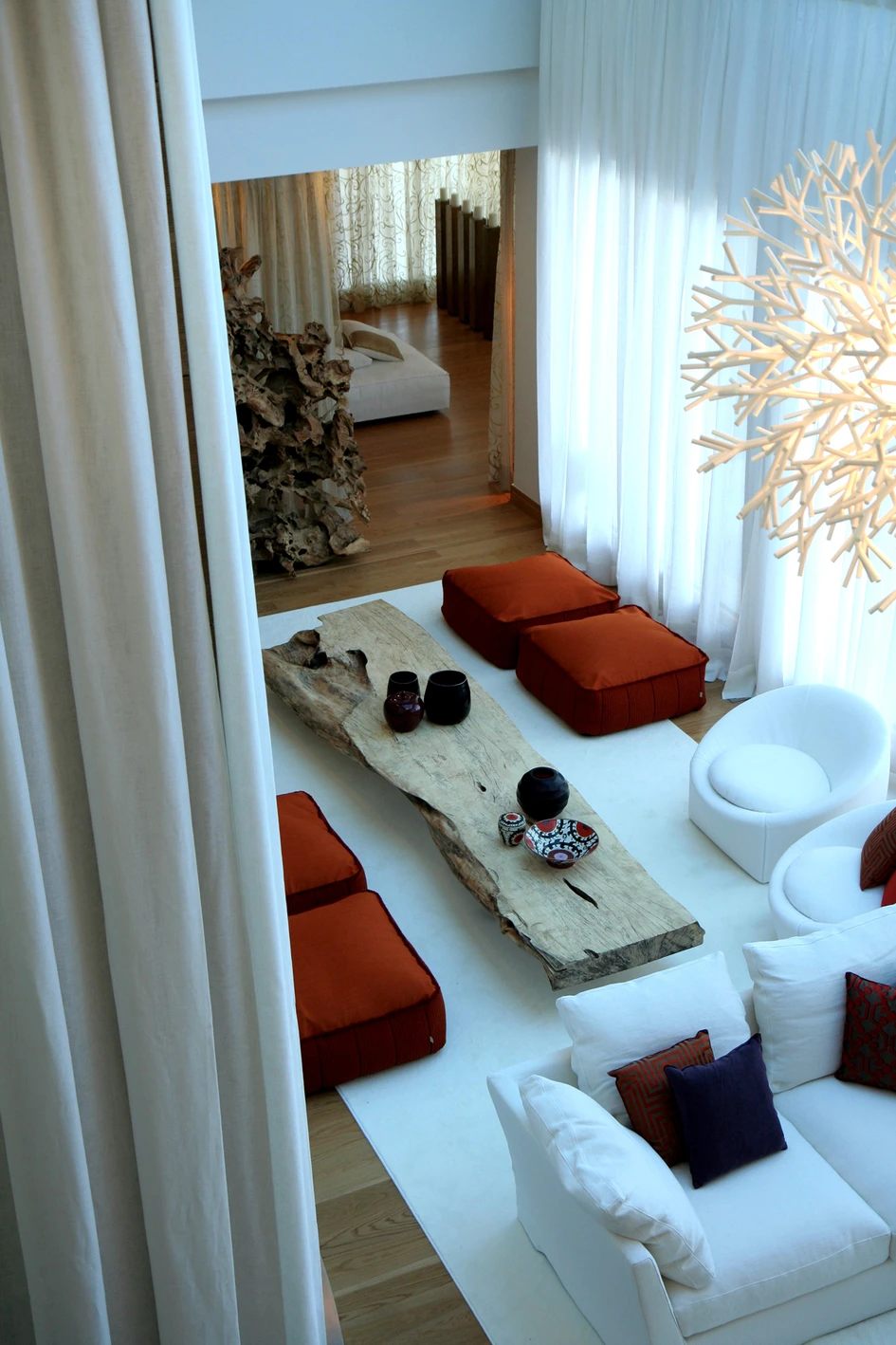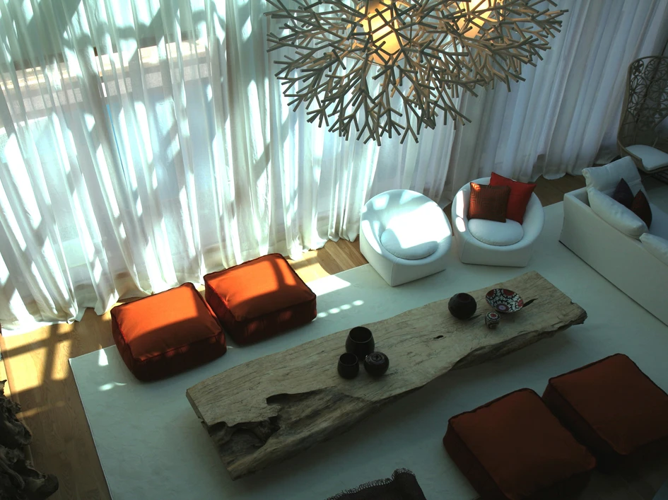 There is a theatrical quality to every small space. Boundaries are not defined by physical walls but by the positioning of furniture, architectural objects, curtains and the quality of light. Overscale teak roots, soft draped walls and perforated metal screens create private spaces and yet maintain visual permeability throughout.
