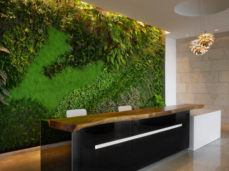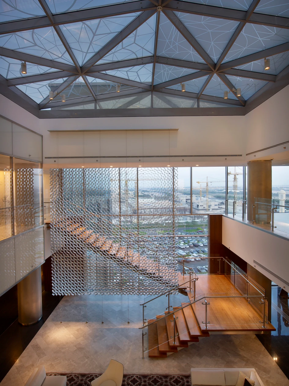 The geographical location of the headquarters also inspired Colacion Studio’s final design of the interiors. In order to take advantage of Kuwait’s desert sun, Colacion incorporated a large skylight to bring daylight into the space. The sun’s heat was strategically filtered through various methods, including the installation of a synthetic mesh window shade in a conference room, specialized UV films on the skylights and large windows, as well as a suspended screen of honeycomb aluminum on the ground level, which partially veils the top flight of the teak and steel stairway. Also, to evoke the feeling of being in a desert oasis, the firm thoughtfully added a vertical garden wall in the ground-level reception area, as well as two more stacked garden walls in the double-height atrium, totaling a 20-foot high lush green feature wall.