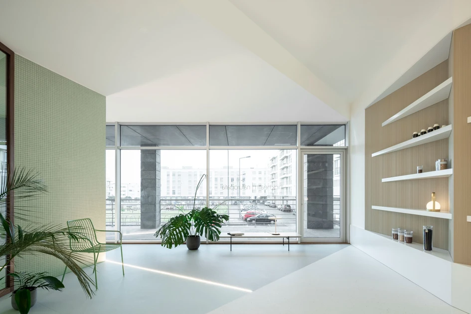 The space forms naturally this concept through the shape, or absence of it, creating an unic moment, open and dynamic, where the few constructive elements captivate us to disconcerting but formalizing perspectives of the space. Assuming transparency as if the space was a single one, where everything can be seen and understood, as if it was an oasis, reinforcing the idea of "seeing and being seen". The color translates the concept and looks to inspire a peaceful and natural vegetation environment.