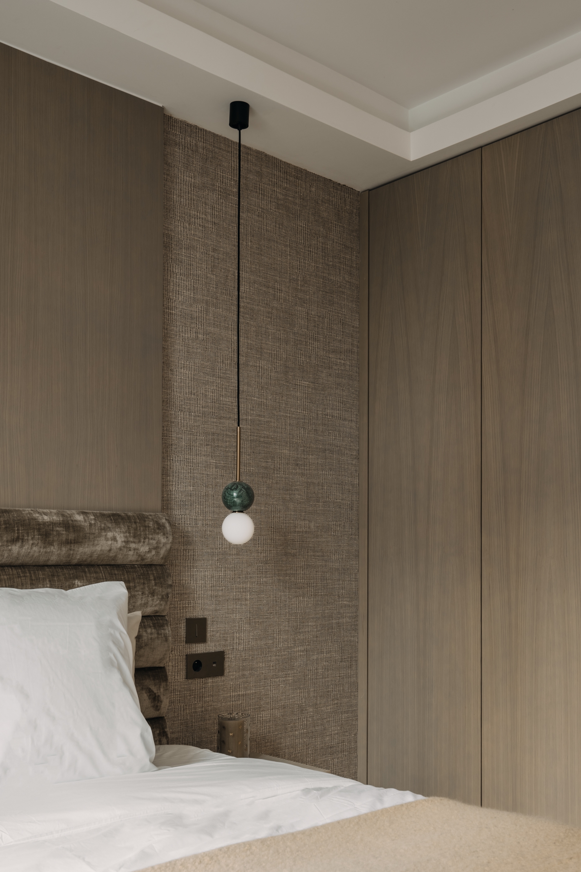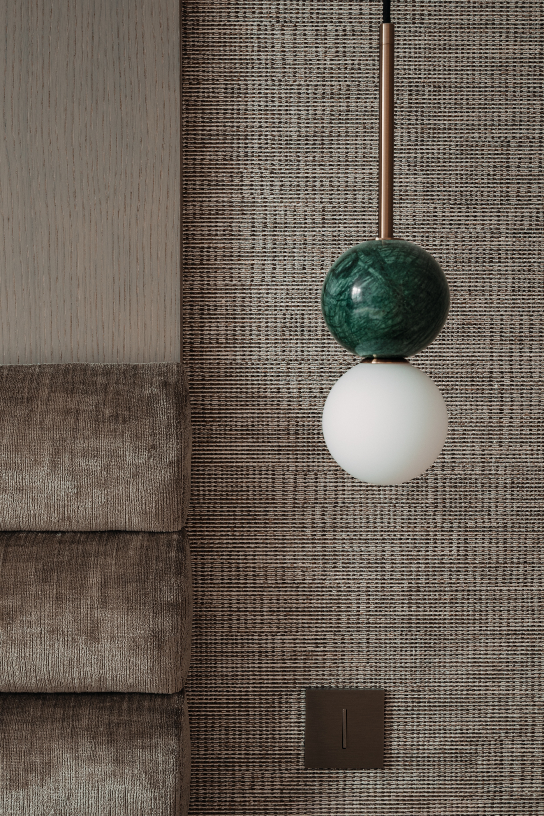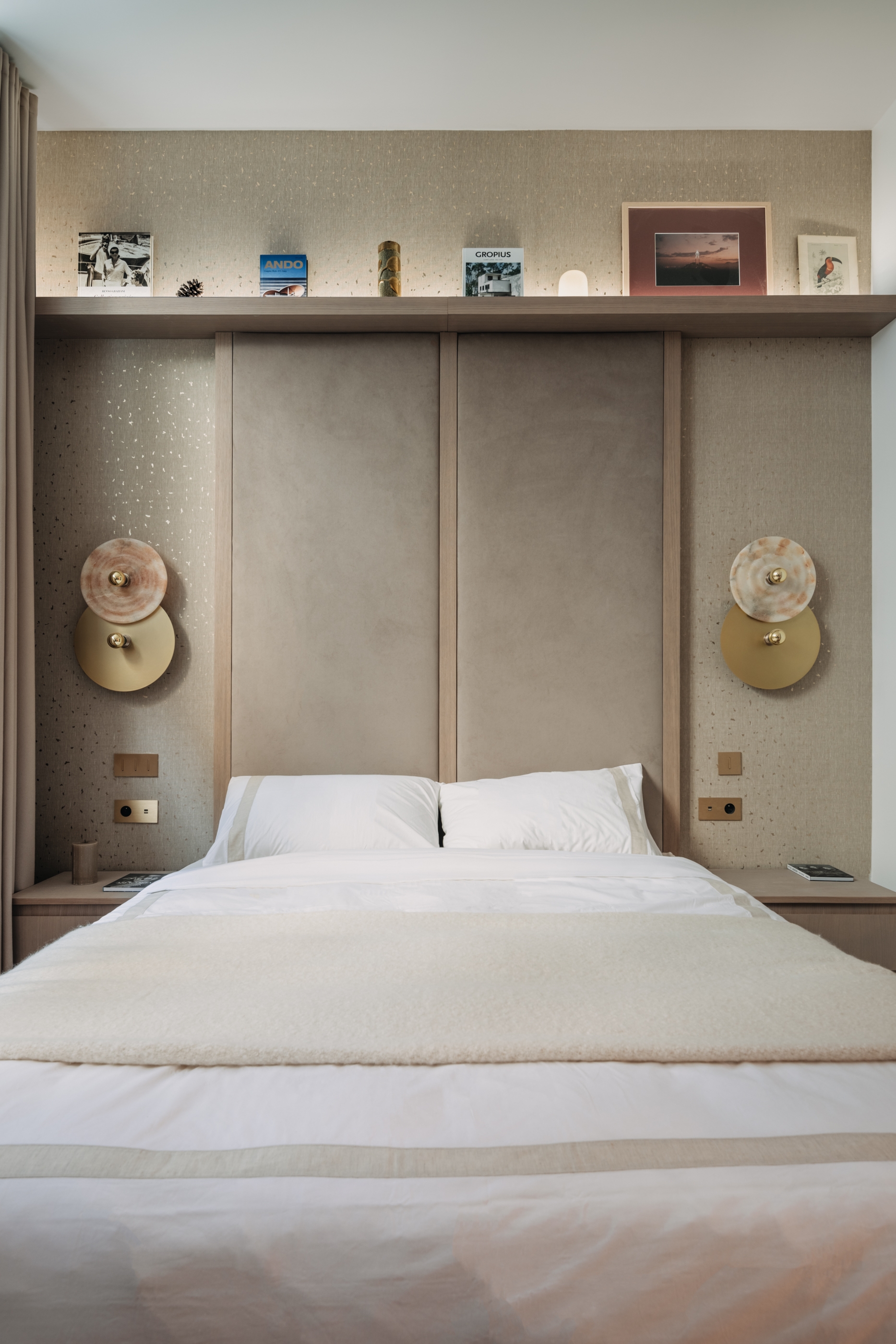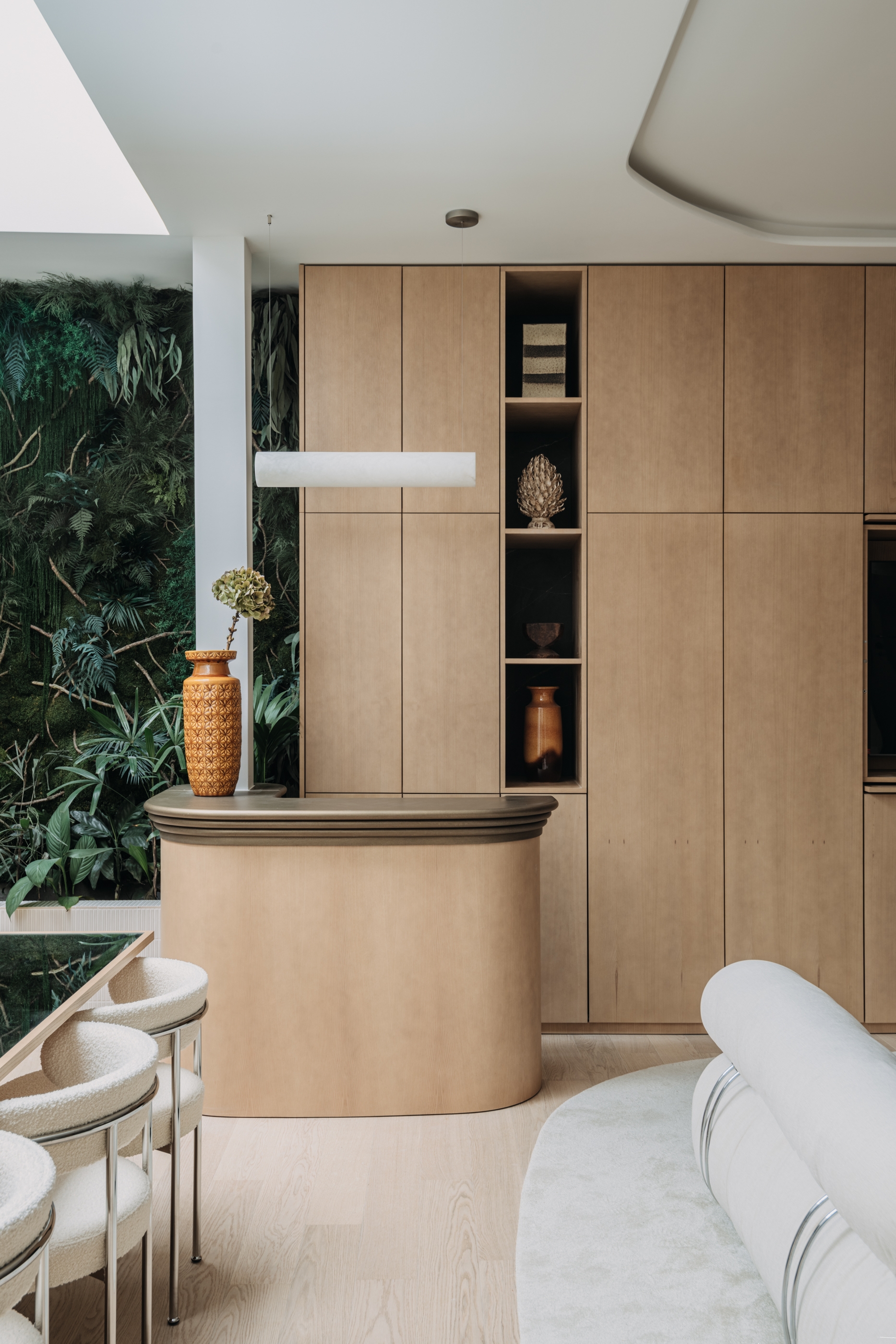 Alongside the reorganization of the space and its positive flow, MERSI meticulously crafted the identity of the apartment by selecting exceptional materials created by artisans and artists. Among these unique pieces are the decorative patina in the kitchen, which creates a subtle cloud-like effect, the panoramic jute fabric wall covering depicting the Viñales Valley, and the living green wall made from stabilized plants.