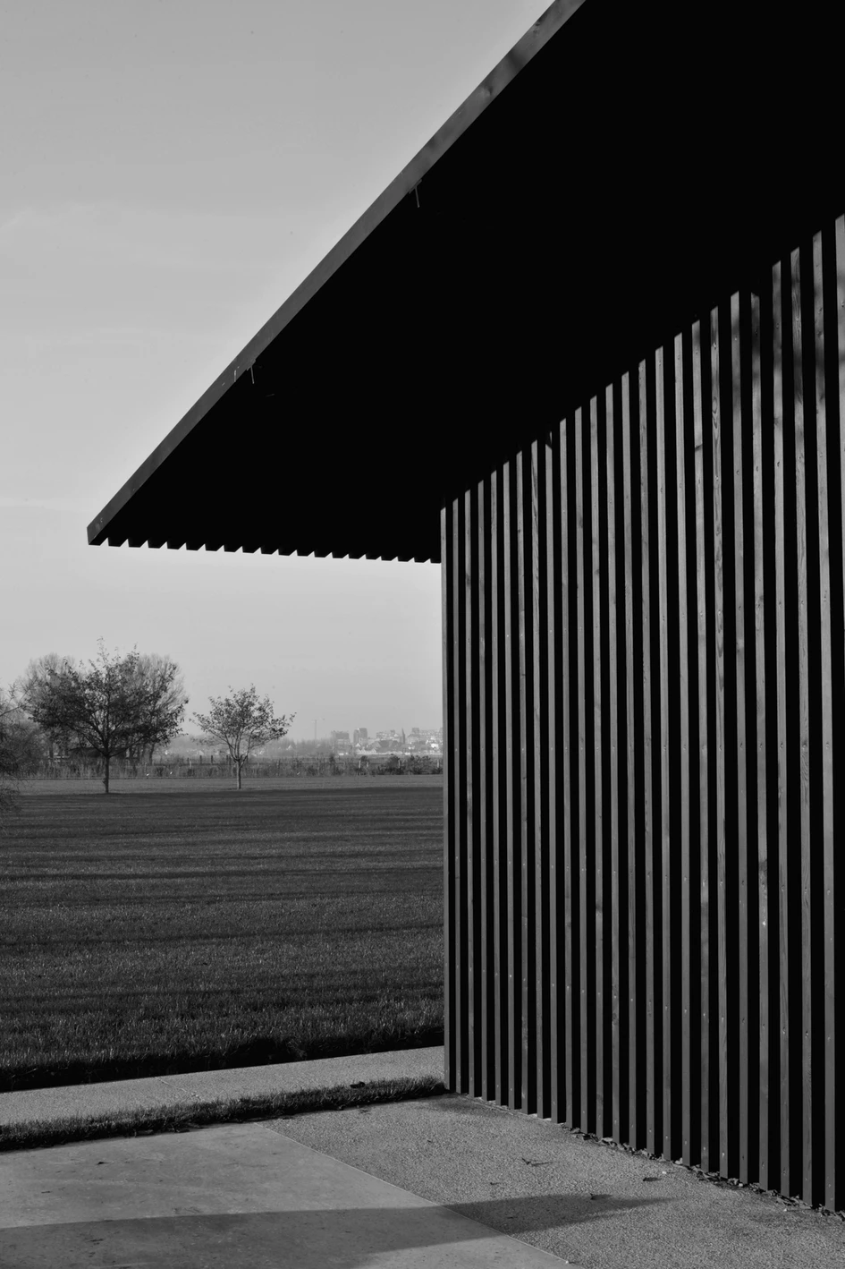 The basic volumes are of a utilitarian typology where function is reduced to a minimum and openings are limited to large sliding gates. The approach of the design and material is deeply considered and contributes to the contemporary character of the project. The design omits any ornament by the application of the façade materiality – gutters, drains, and ridgelines are abstracted to the point that they become almost invisible. Making reference to old wooden barns, the repetitive timber motif merges sills, eaves, and extends onto the roof whereas the farm house is granted larger openings for views to the landscape and courtyard and distinguishes itself from the other volumes by large chimney flues. From a distance the abstraction of the three wooden volumes is complete – the closer one gets to the project the more details become visible. The architecture is designed at the scale of furniture work. The abstract formal language of the façade is poetic in its refined detailing and, in the sunlight, the diaphanous rhythm of the slat work is further emphasized.