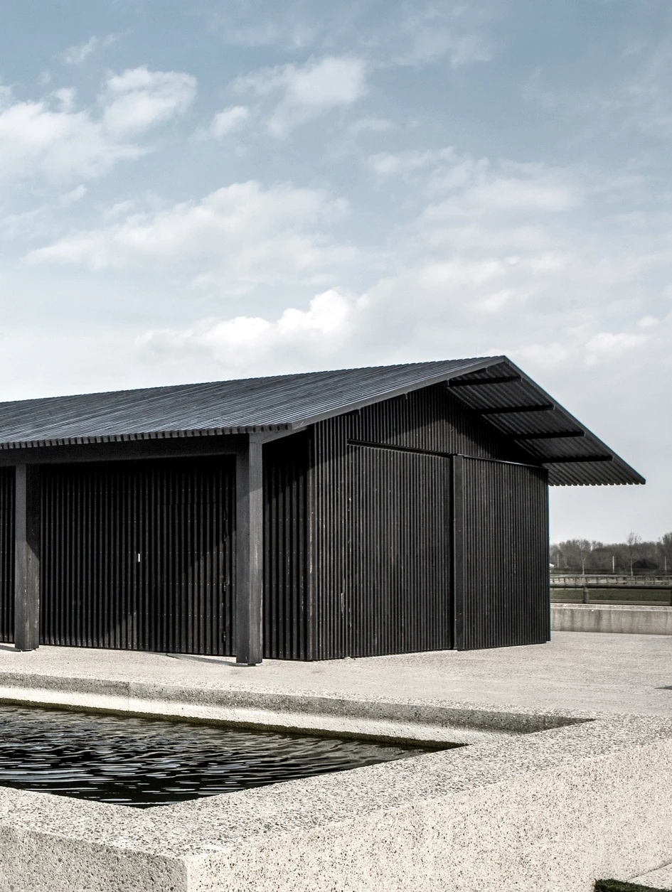 On reclaimed land close to the sea, with views delineated by an urban coastline, a limited volume of trees, shrubs, and a centrally sited farm buildings define the organization of the domain. The assignment was to replace existing structures with a contemporary farming business, stables, and surrounding orchard. The project has created a central place in the open landscape with an outspoken identity of the ‘yard’ with three elongated black-slatted wooden volumes forming the heart and life of the farm. The house, horse stables, and barn creating a clear boarder around the courtyard, which remains only partially enclosed, permitting a connectedness to the surrounding meadows. On a smaller scale, the open and flat character of the courtyard, on one hand, is broken by an elongated water feature – centered between the house and stables – and on the other its flat character is broken by a 60-meter retaining wall that catches the small undulation in the topography and terminates in an integrated cesspit.
