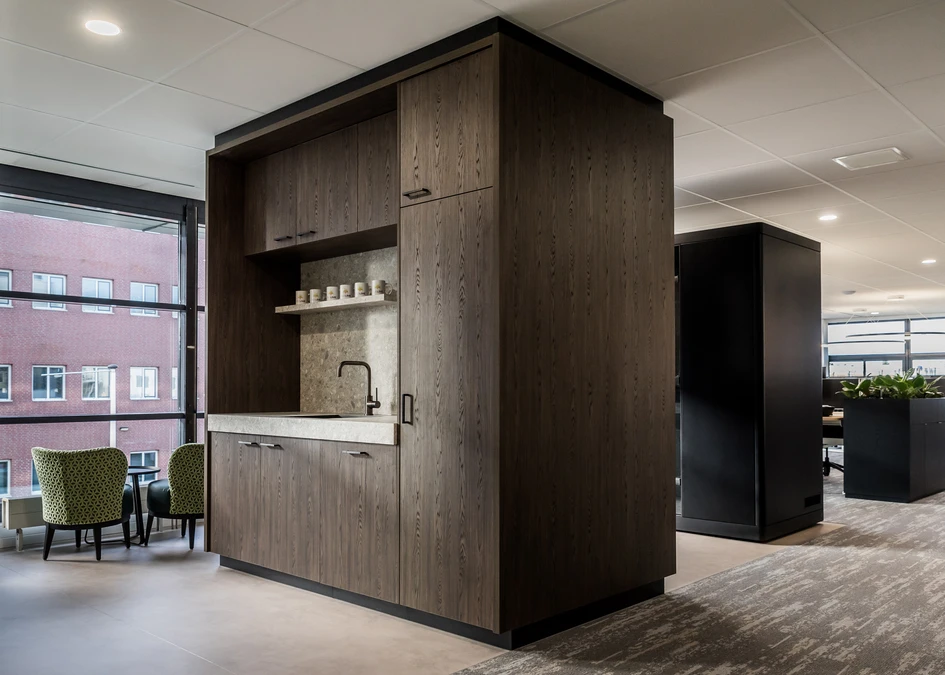 Art2Go wanted to strike a balance between corporate and fun. Desk units made from UNILIN Evola panels in Elegant Black and Dainty Oak Café Noir are a beautiful foil to the kitchen worktops in Ceppo Mineral Grey.The contrast between the light tiles and dark wood creates a relaxed atmosphere, suitable for both business meetings and relaxing moments.