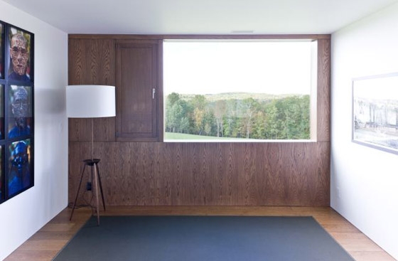 The four equal sized boxes are built as simple wood construction covered with corrugated metal panels on the outside and wood and gypsum panels on the inside. The floor plan is based on the needs of a traditional countryhouse. Only partially the organization of the rooms is a direct consequence of the rigid outer form. The Living Room focuses on the different light conditions needed for an existing and future art collection, while the great view into the nearby countryside is present without being dominant. The sequence of the different rooms reflects the idea of a private gallery. Natural light is coming into the spaces through the openings in between the outer boxes.