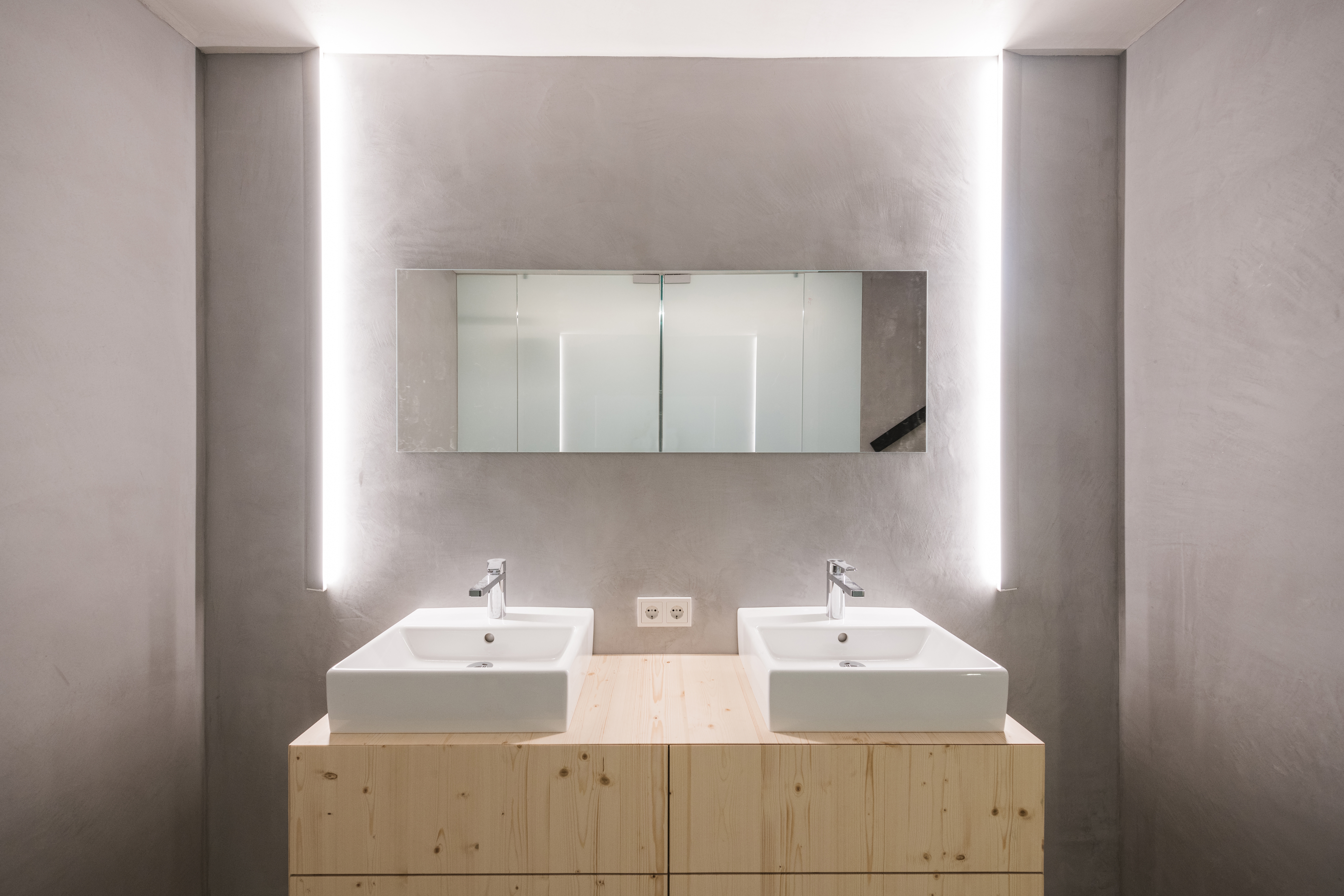 The kitchen has become much brighter because some windows have been added into the side corners of the north facade and the bedrooms have become more spacious and brighter. In the basement, daylight enters through a glass cube above the staircase and some horizontal and vertical LED strips create an atmosphere similar to the one that Lackner created in the main room through the windows and the indirect lighting made by the sidelights.