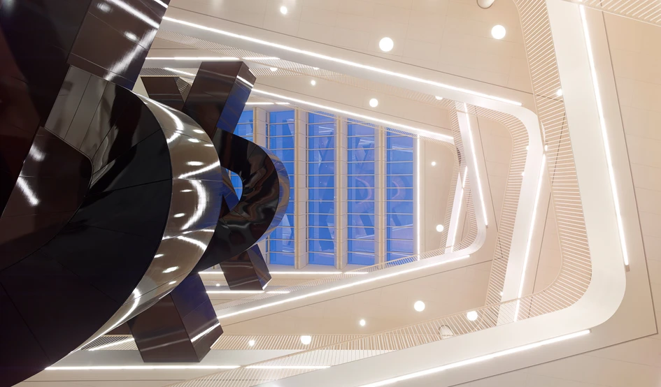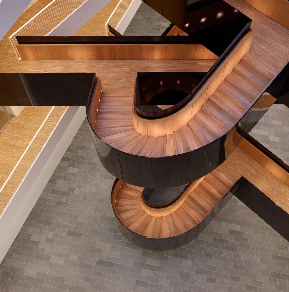 From the core of the star-shaped building, a daylight filled atrium connects the lobby level containing all common functions, with the office levels, where the various UN agencies are distributed. From the atrium a central staircase binds all levels together. 3XN has created the staircase as a dramatic spatial sculpture, which is to be seen as a symbol of the UN’s work to create dialogue, interaction and positive encounters between people in all parts of the world. In the daily life, the sculptural form inspires the UN employees to want to use the stairs, and thus the staircase also forms the basis for dialogue, cooperation and informal meetings between the various UN organizations.