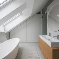 The interiors of all the houses have been designed in a fundamentally similar way: surfaces of exposed concrete, white plaster, oak floors and built-in furniture in a combination of white paint and natural oak veneer. The floors in the service areas are tiled with hexagonal mosaic in two shades of grey, and the walls of all bathroom spaces and the indoor swimming pool in the investor's house are finished with light grey screed. The aim was to create a calm and simple background for the life of the inhabitants of the houses and space for quality elements of free standing furniture. In the investor's villa also for the collection of contemporary Czech art characterised by its distinctive colour scheme.