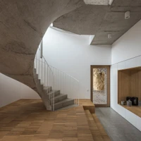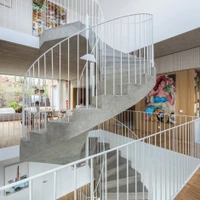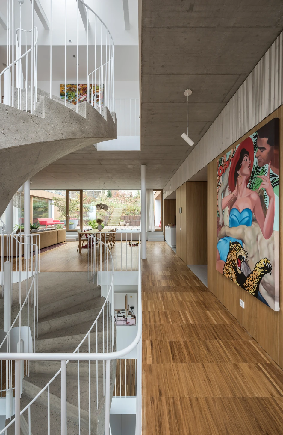 Essential elements of all the houses are their staircases. In the client's house, it is a spiral monolithic reinforced concrete staircase connecting all floors and allowing a vertical view through the entire house. This in-situ staircase was conceived as a massive sculpture with significant presence, visible also from the street through the glazing of one of the two loggias on the facade. It is complemented by an extremely subtle handrail made of bent, welded and lacquered white bar steel. A lightweight, white-painted steel staircase with a subtle welded zig-zagging structure runs through the smaller family house for a change. The middle apartment building is traversed by an exterior steel staircase with grating used for the treads; walking up it offers contact with the massive rock wall.