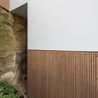 The roofs of the two outermost houses were designed as hipped to soften the overall mass. A rock wall is visible through the widening partitions between the buildings. The forefront of the buildings towards the street has a more urban character (stone paving, newly planted trees), while the steeply sloping garden on the cliff above the houses is more wild and makes use of the original mature vegetation. It is bounded by the wall of the Star Game Reserve.