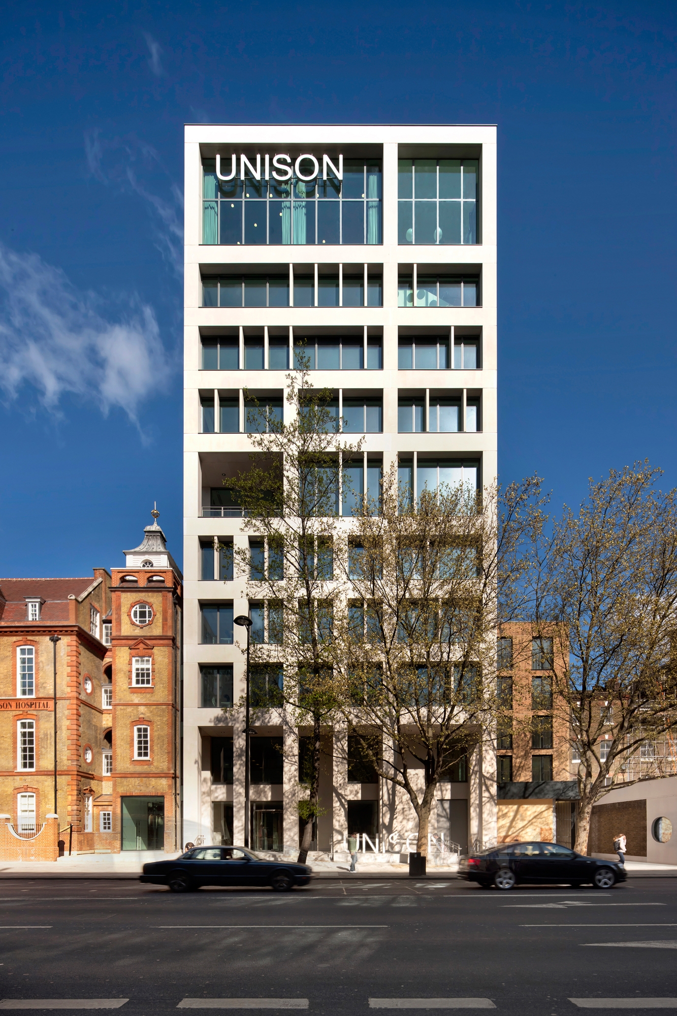 This office-led mixed use scheme on the site of a Grade II listed former hospital on the Euston Road is the headquarters and symbolic face of UNISON. The scheme also includes affordable and private residential units to the rear. The scheme unites a disparate campus of buildings, integrating new and old and providing a strong architectural presence. At the heart of the scheme is an open atrium, surrounded by the major public spaces of the complex, which allow clear views in and out.