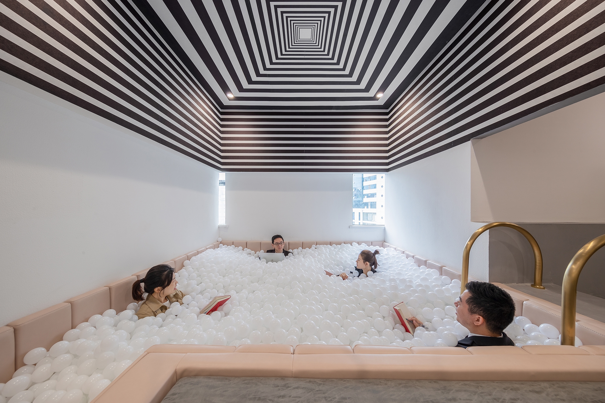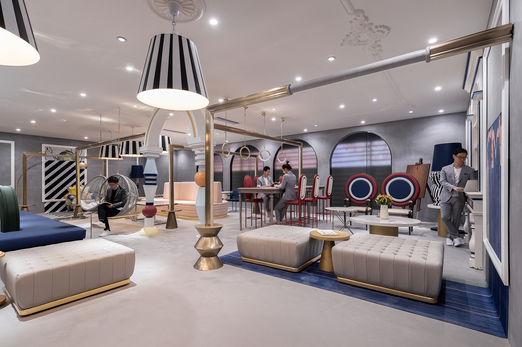 As reaching 3F by taking the escalator from the lobby, people will be firstly welcomed by the words "Work Hard" on a show window, and then see the public reception area with grotesque artworks when turning around. X+LIVING utilized elements of gym equipment in the space to convey the idea of keeping balance between health and work. The champagne gold horizontal bars and rings are very eye-catching, enriching the spatial experience. Chairs were designed with diversified forms and shapes for the sake of serving different needs, including social interaction, leisure, learning and staying alone.