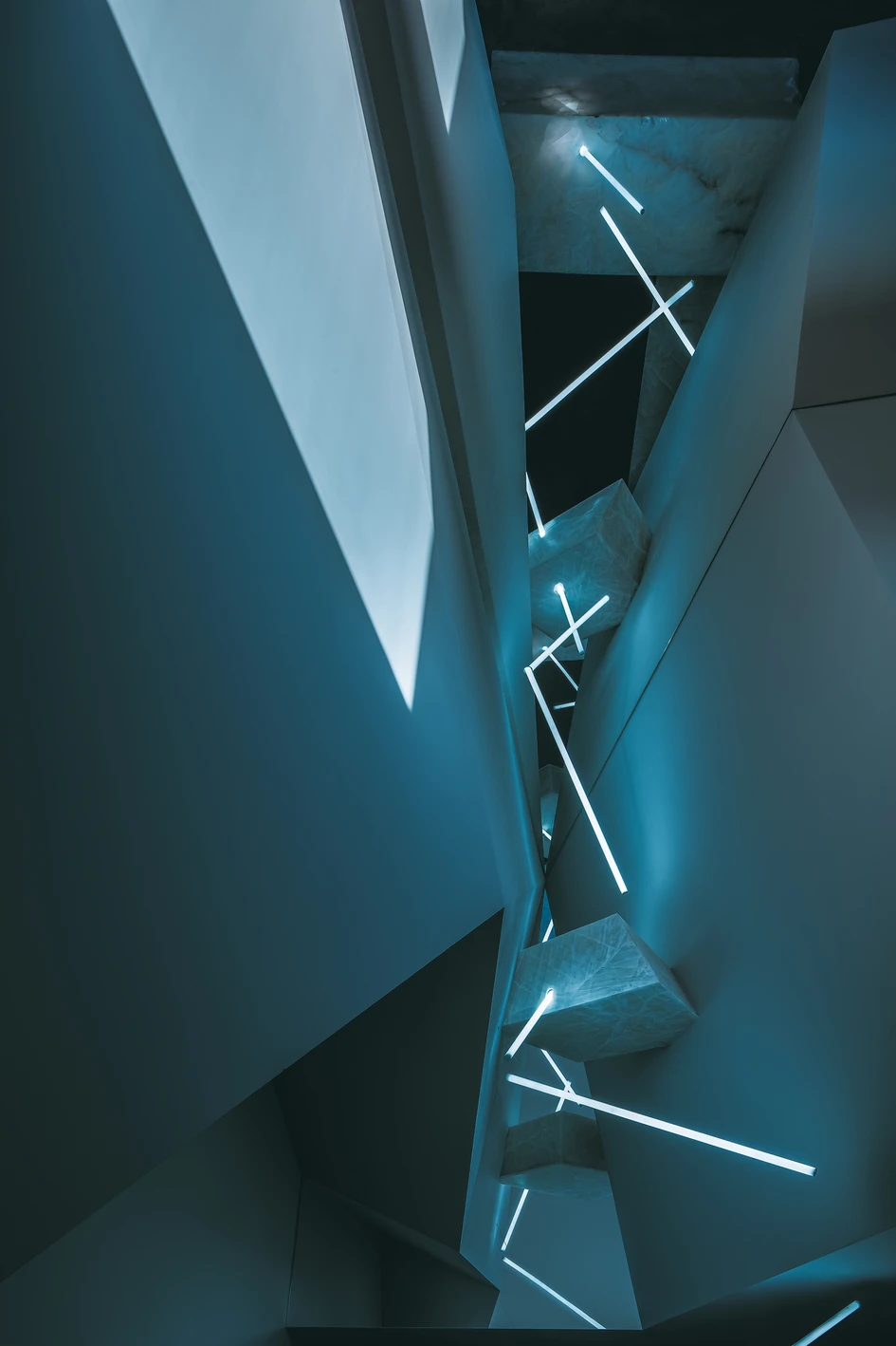 First of all, we arranged a canyon shape in the front lobby space, making this reception space full of fantasy and impact. It is worth mentioning that the beauty of the design is expressed by using the texture of the entire stone. The strength of the design comes from our choice of letting the light pass through the small stones on the ceiling, and reaching the stone front desk that directly penetrates the whole. This method is used to express the beauty of the light transmission of the stone and the beauty of its original weight.