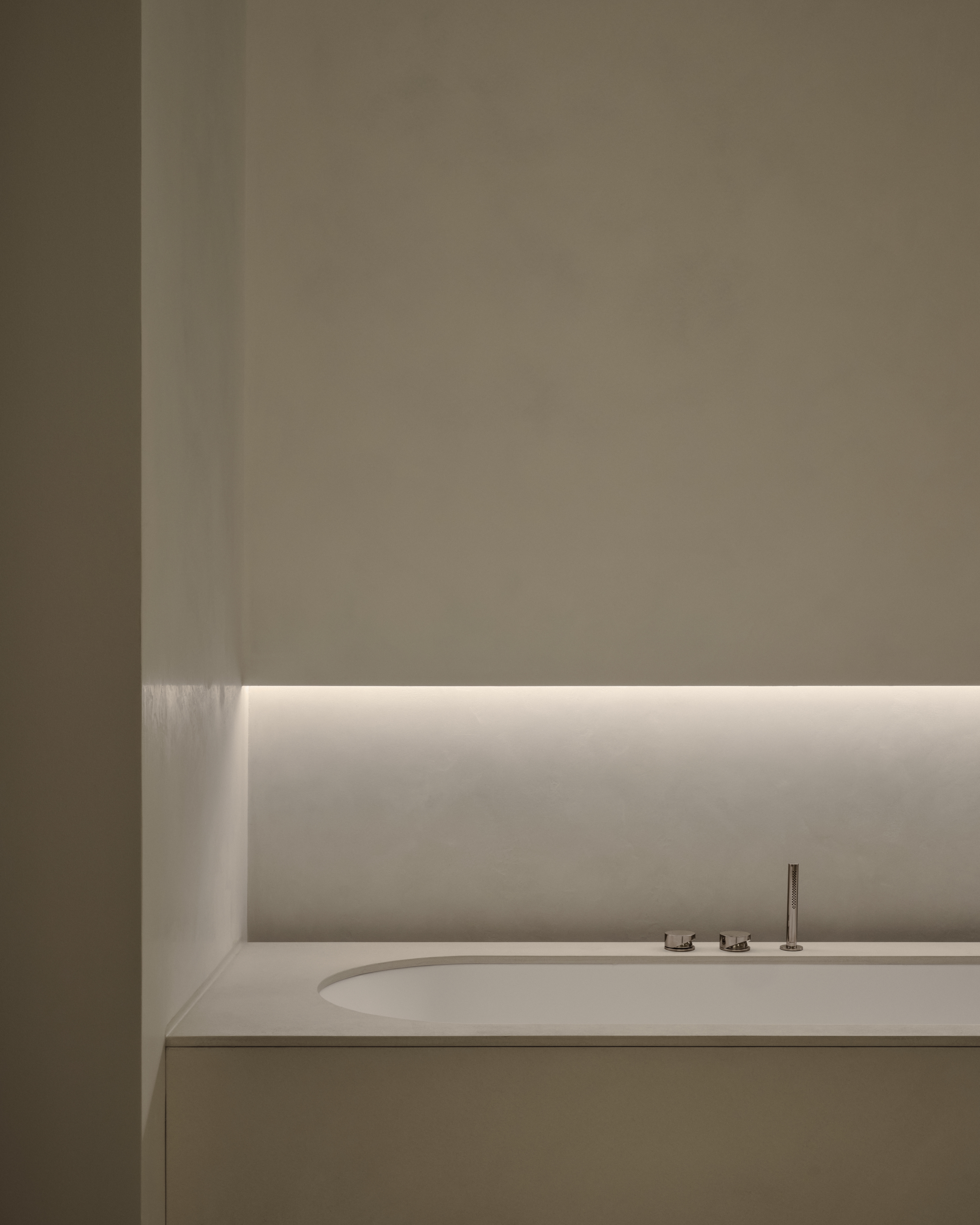 Except for new windows, new acrylic finish, and a rebuilt porch entrance, the façade of this Victorian house remains unaltered. Inside, original features and contemporary design are thoughtfully intertwined. Timeless, honest materials create a sense of cohesion throughout the home. Plaster walls and walnut furniture add warmth to the kitchen. In the bathrooms are tactile finishes like micro cement and low-relief tile. While the new interior is a departure from the original, the staircase banister is preserved to harmonize the old with the new.