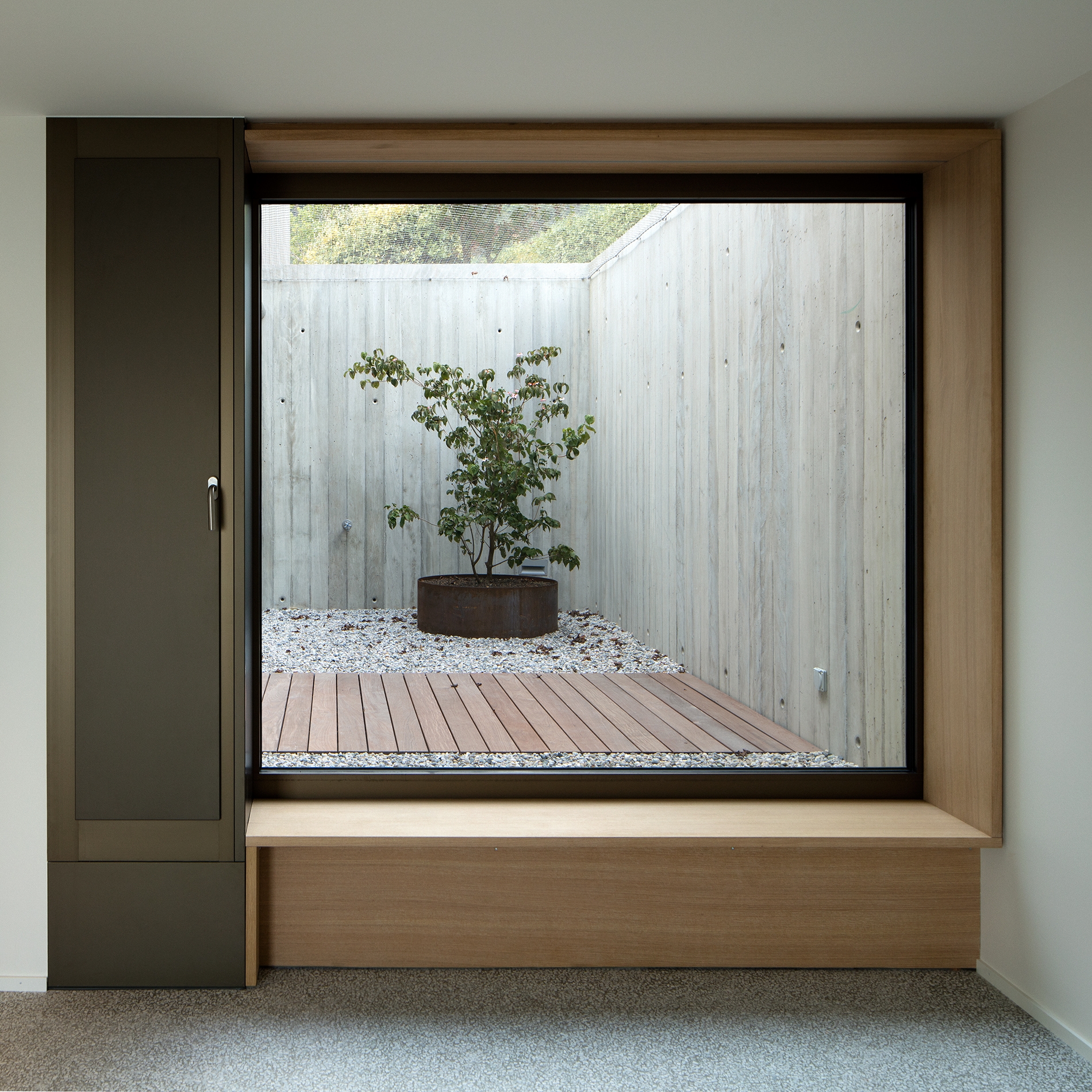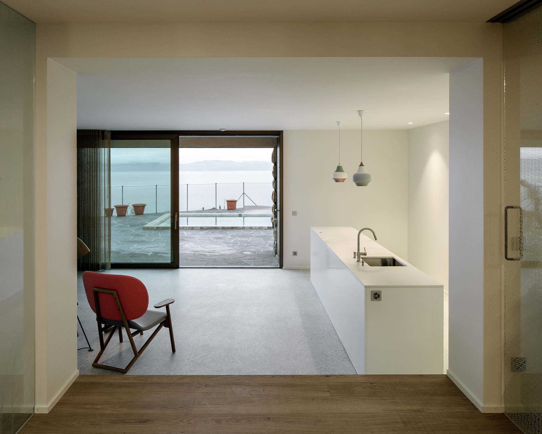 The new construction on the upper level takes exactly the outer perimeter of the demolished volume. A single-storey wooden volume with a pure four-sided roof forms the living space that opens onto the lake from the south through large bay windows and onto the rear garden with views of the Jura mountains. Glass facades folding inwards create on the north side the entrance and on the south side a covered terrace with panoramic views.